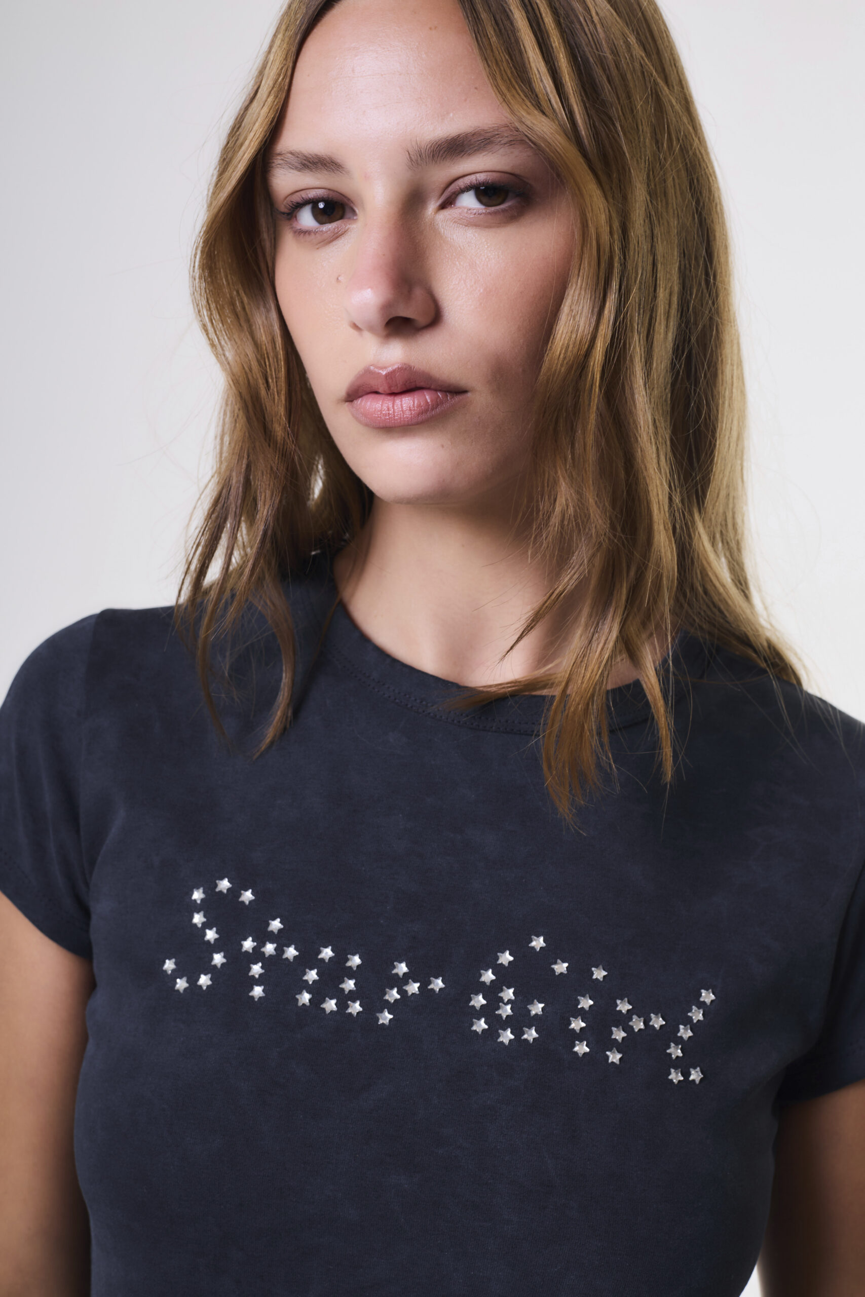 New$ 12.000,00Remera baby tee con hotfix cristal con frase en delantero.