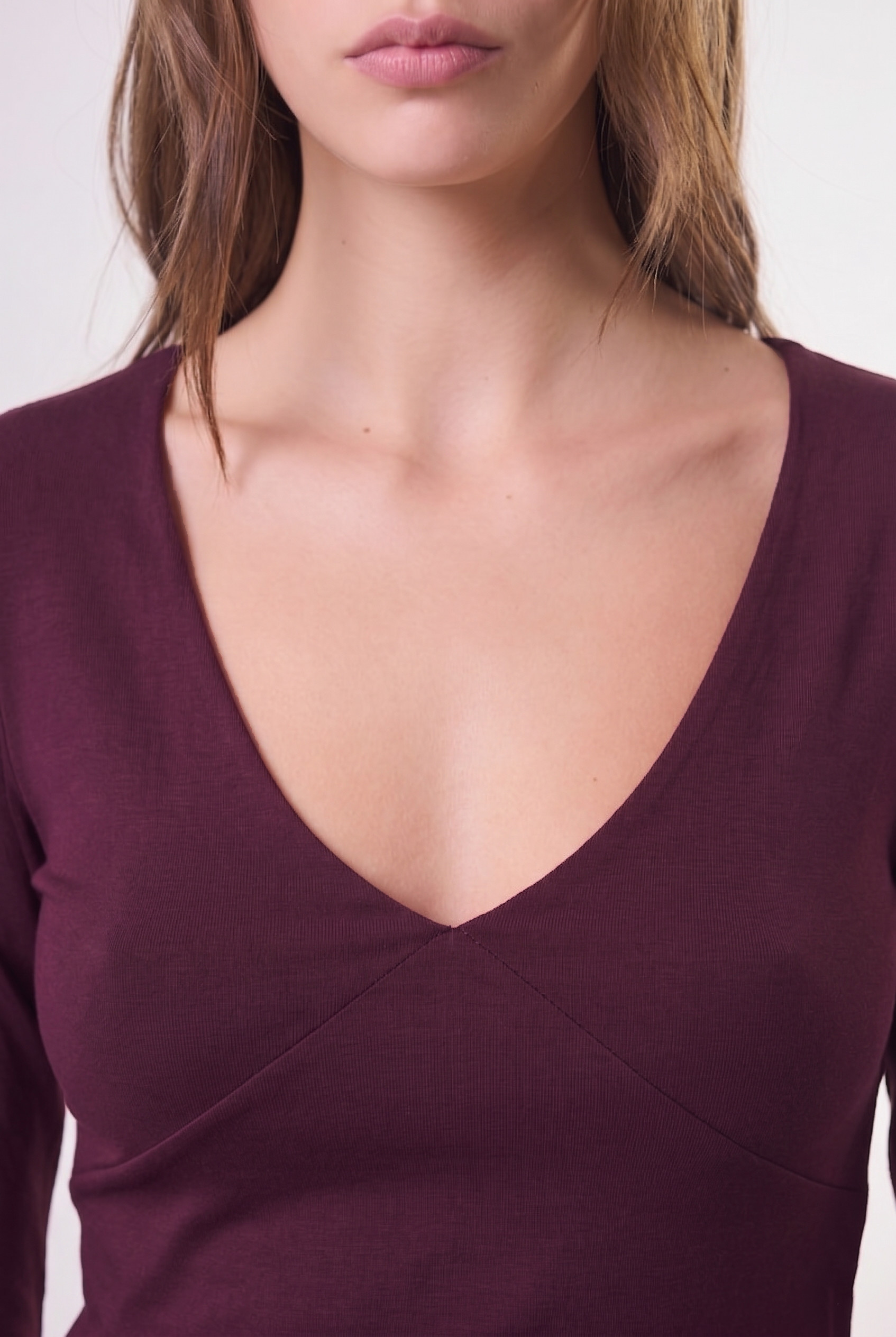 New$ 12.000,00Remera de mujer manga larga de calce adherente con detalle de cuello escote en v y recorte en el busto. Composición: 95% Poliéster 5 % Spandex