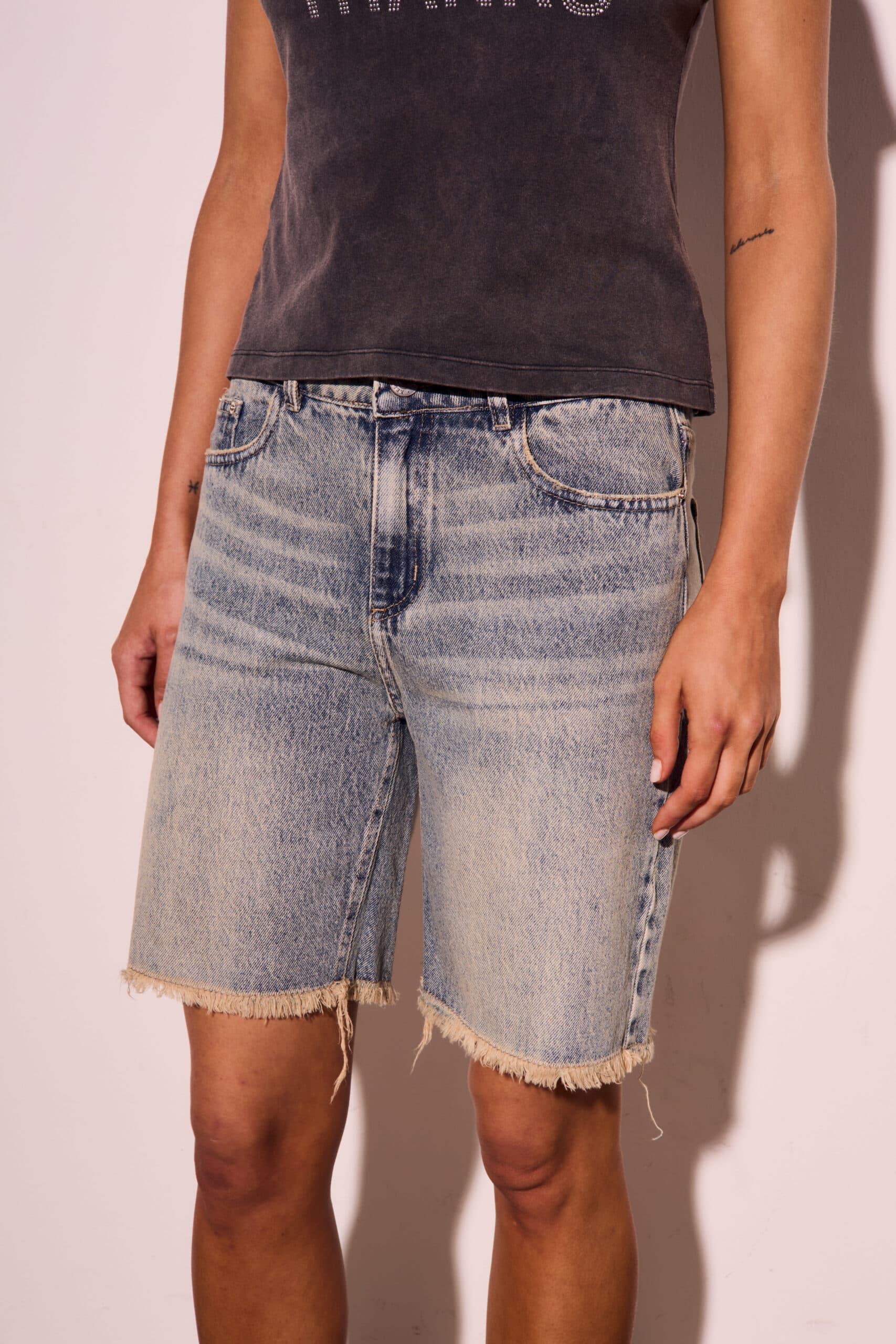 $ 24.000,00Bermuda de jean rígido con flecos en el ruedo.