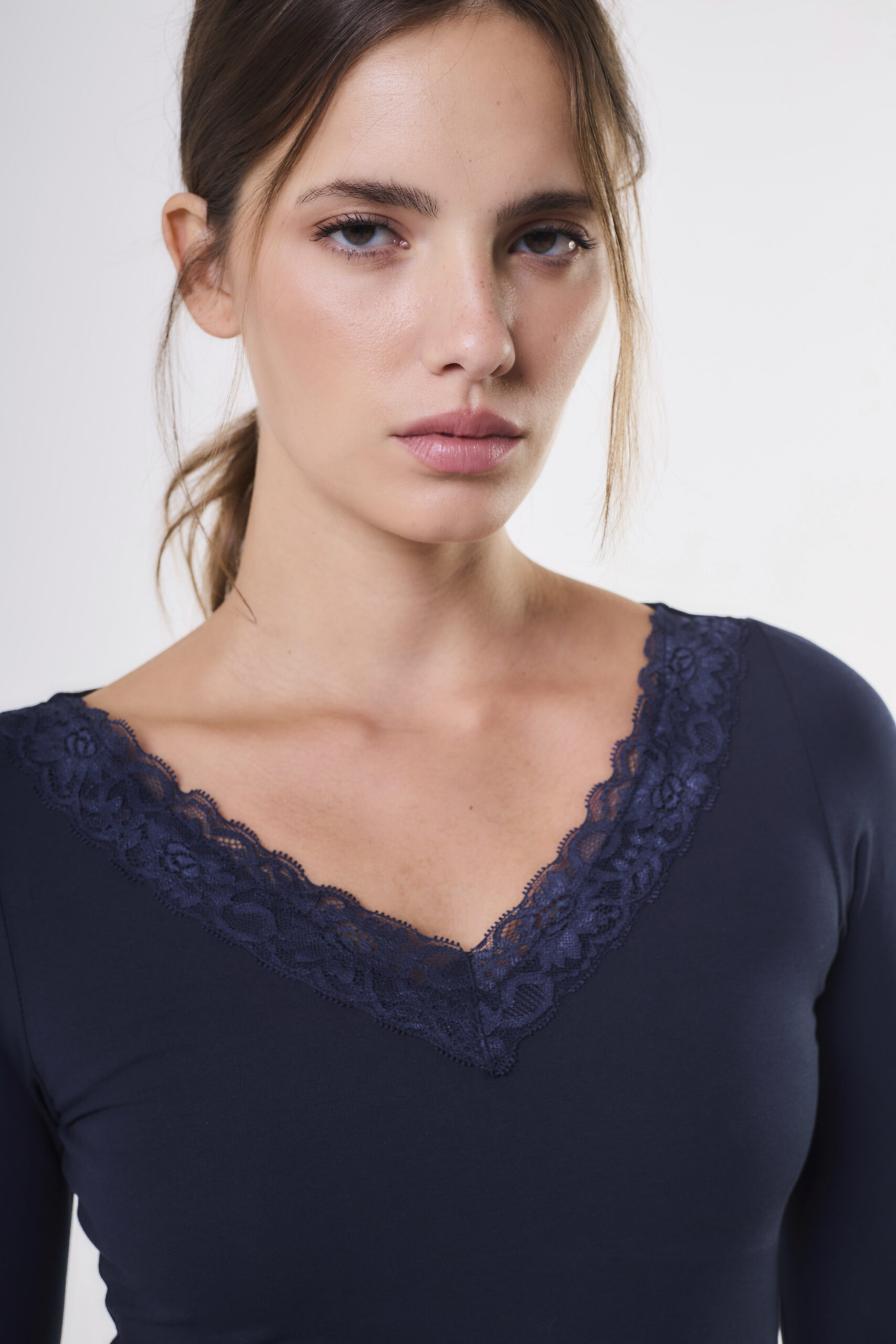 New$ 10.000,00Remera con escote en V, manga larga y detalle de puntilla al tono en el cuello.