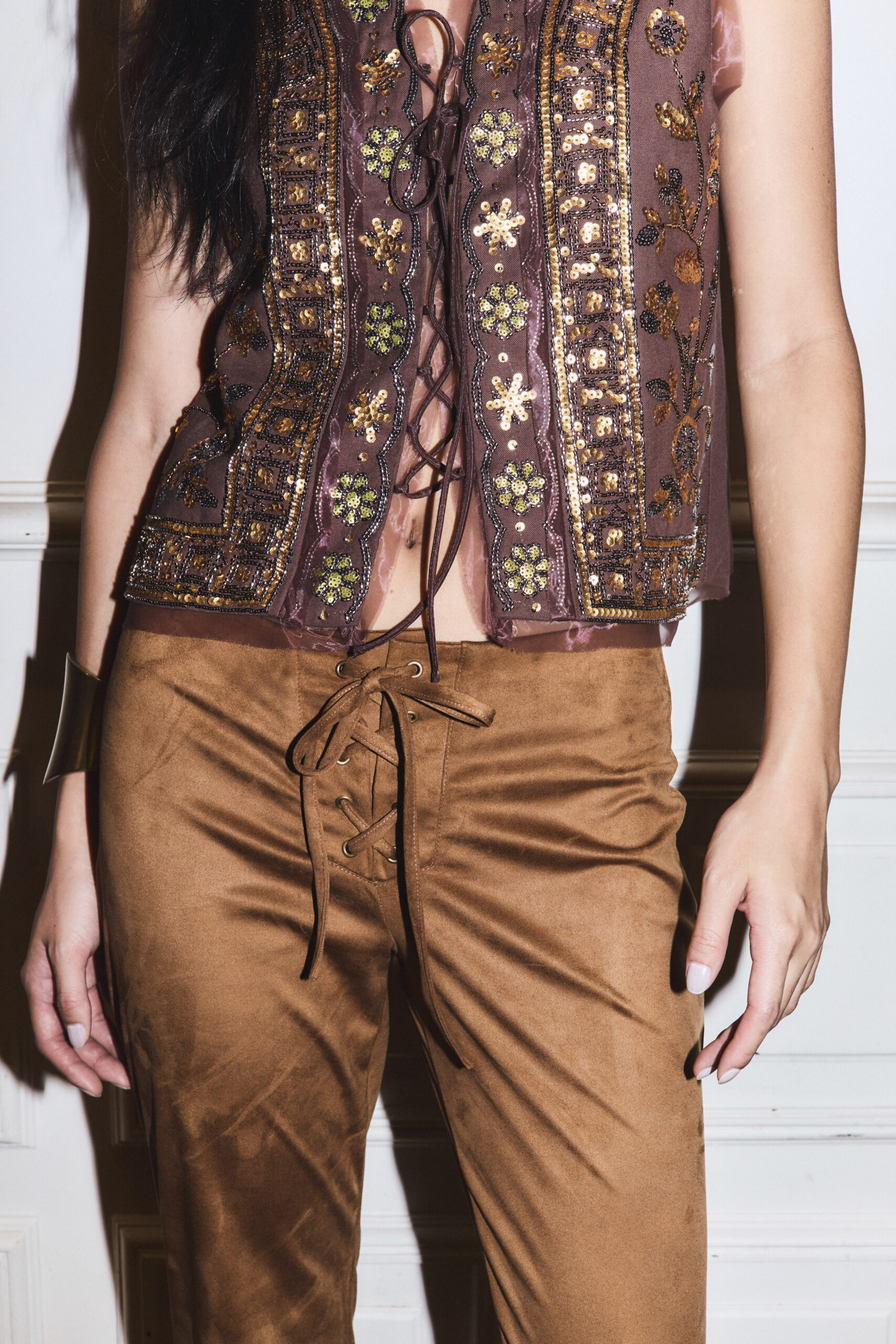 New$ 22.000,00Pantalón de tiro medio de calce flare con detalle de ojalillos y cordón de acceso en cintura.
