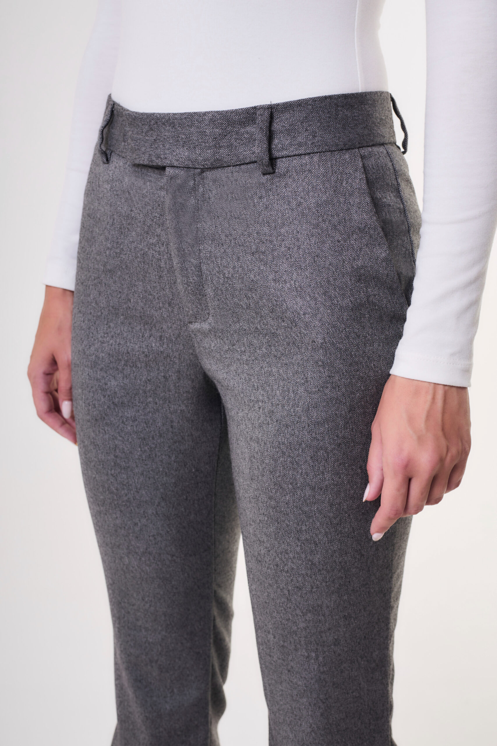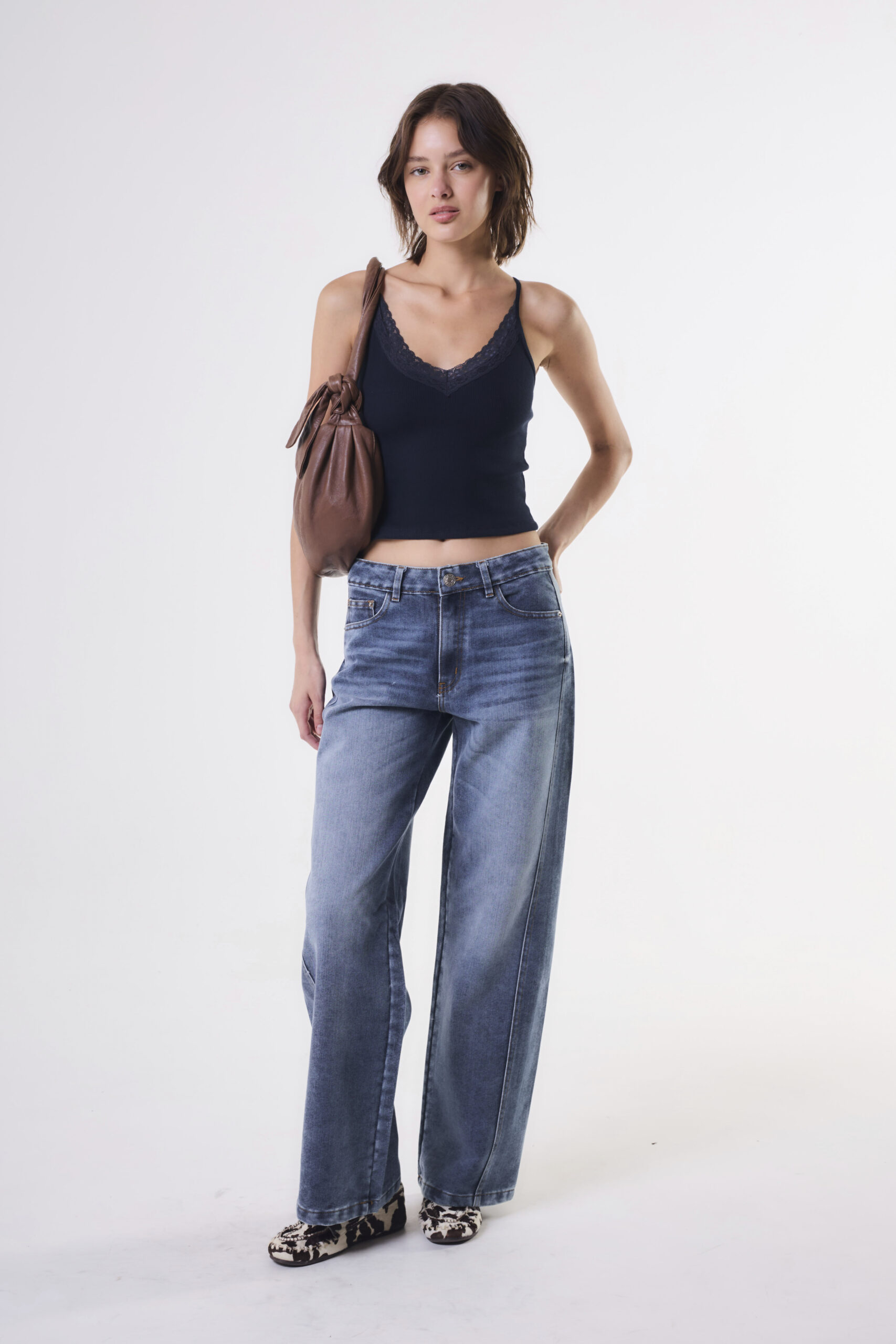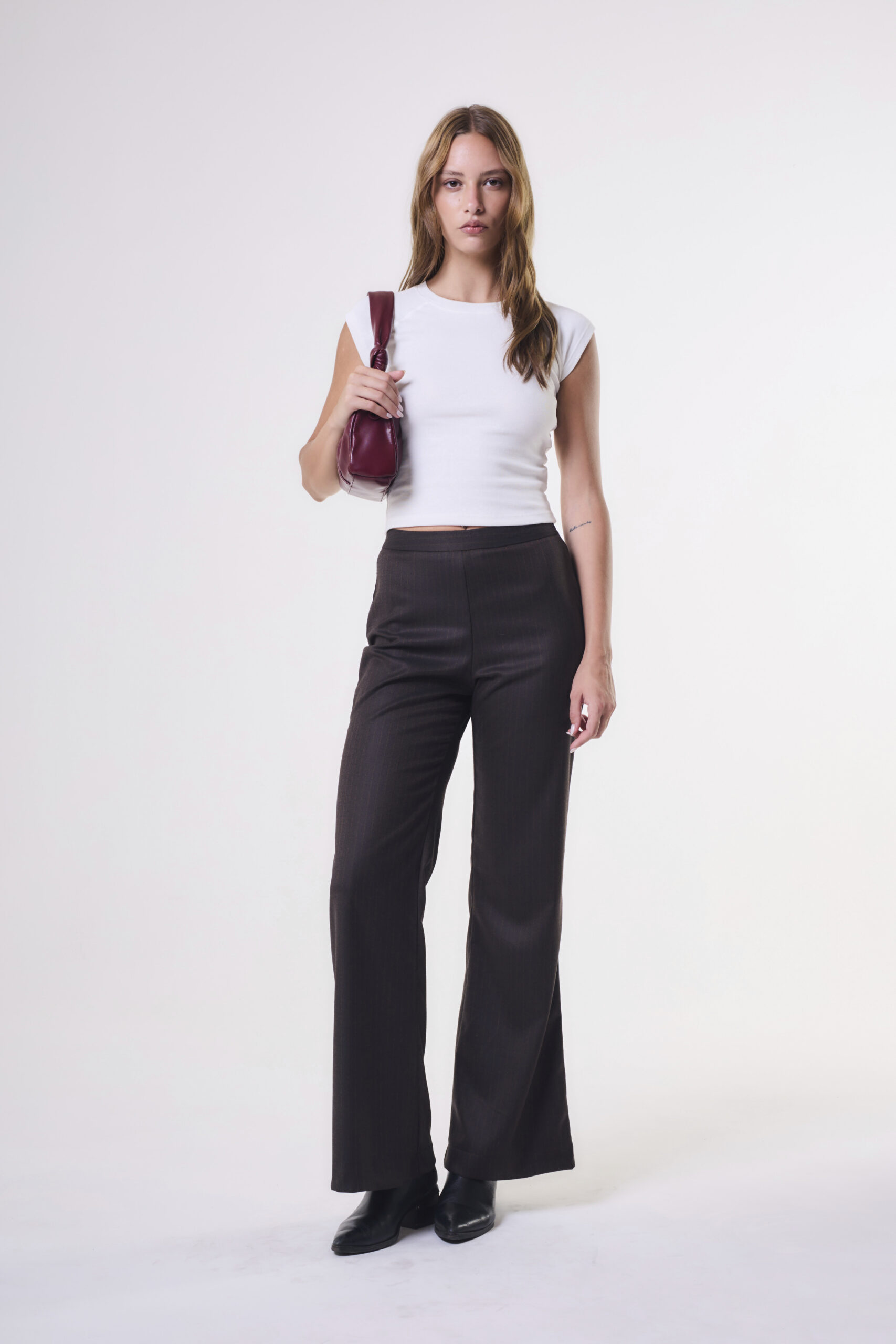$ 24.000,00Pantalón de tiro medio de calce flare. La prenda lleva pinzas de ajuste.