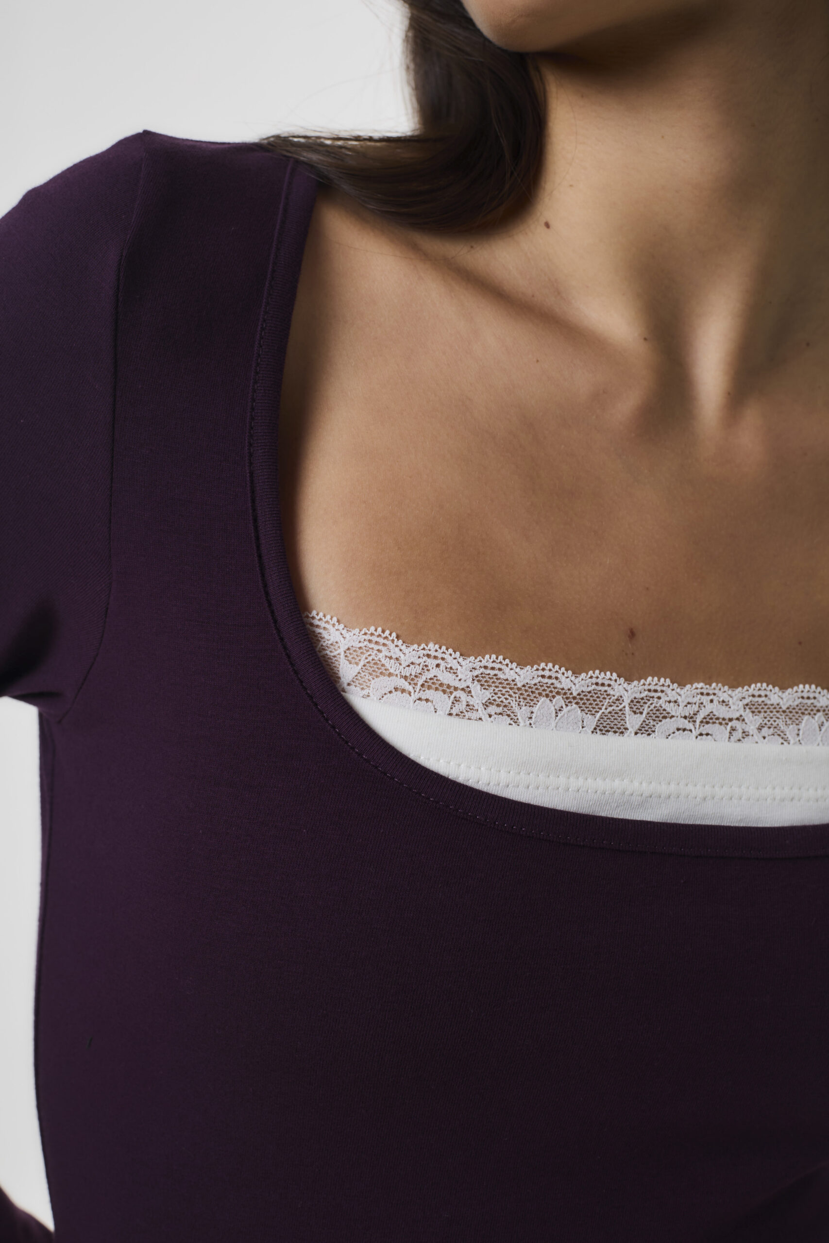 $ 12.000,00Remera manga larga con escote cuadrado con terminación en collareta y cartera de botones tipo pechera fantasía.