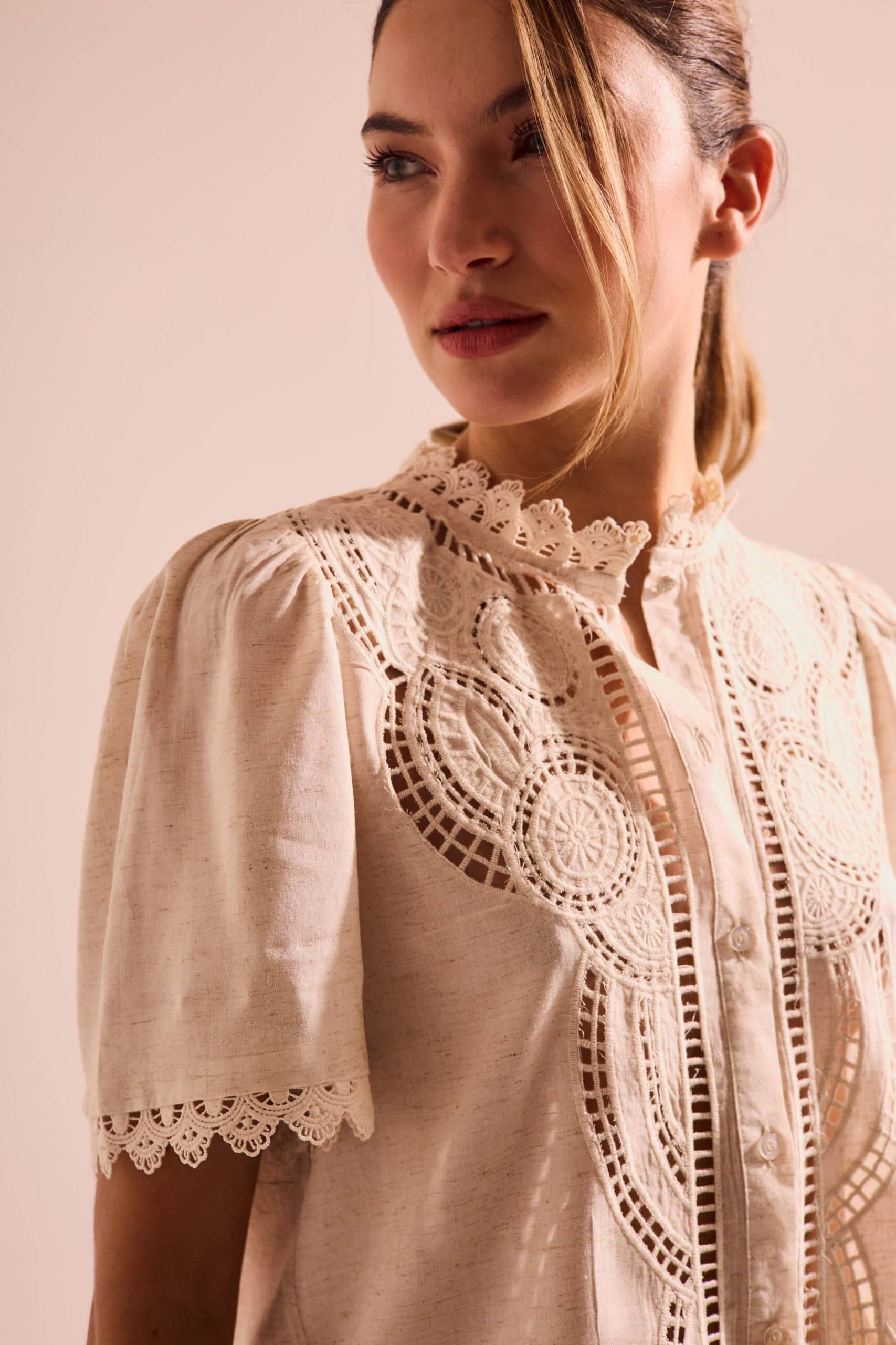 $ 28.000,00Camisa de calce recto manga corta con cuello redondo. Lleva puntilla al tono en cuello y mangas al igual que bordados calados tipo entredos que recorren los delanteros. Acceso mediante botones camiseros al tono en cartera simple. Confeccionado en lino camisero liviano. Composición: 85% Viscosa 15% Lino La modelo está […]