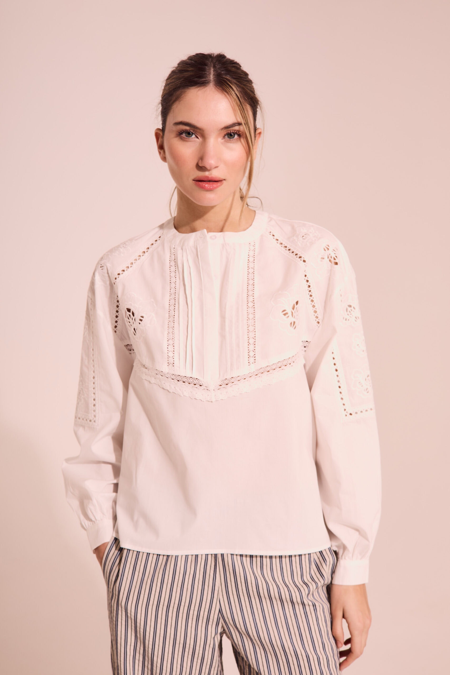 $ 29.000,00Blusa de calce recto manga larga. Lleva mangas abullonadas con tirilla y botón al igual que bordado calado al tono con entredos. La prenda tiene cuello mao con cartera de botones pechera, con botones camiseros al tono personalizados de la marca. El delantero tiene bordados calados, entredos, puntilla y alforzas […]