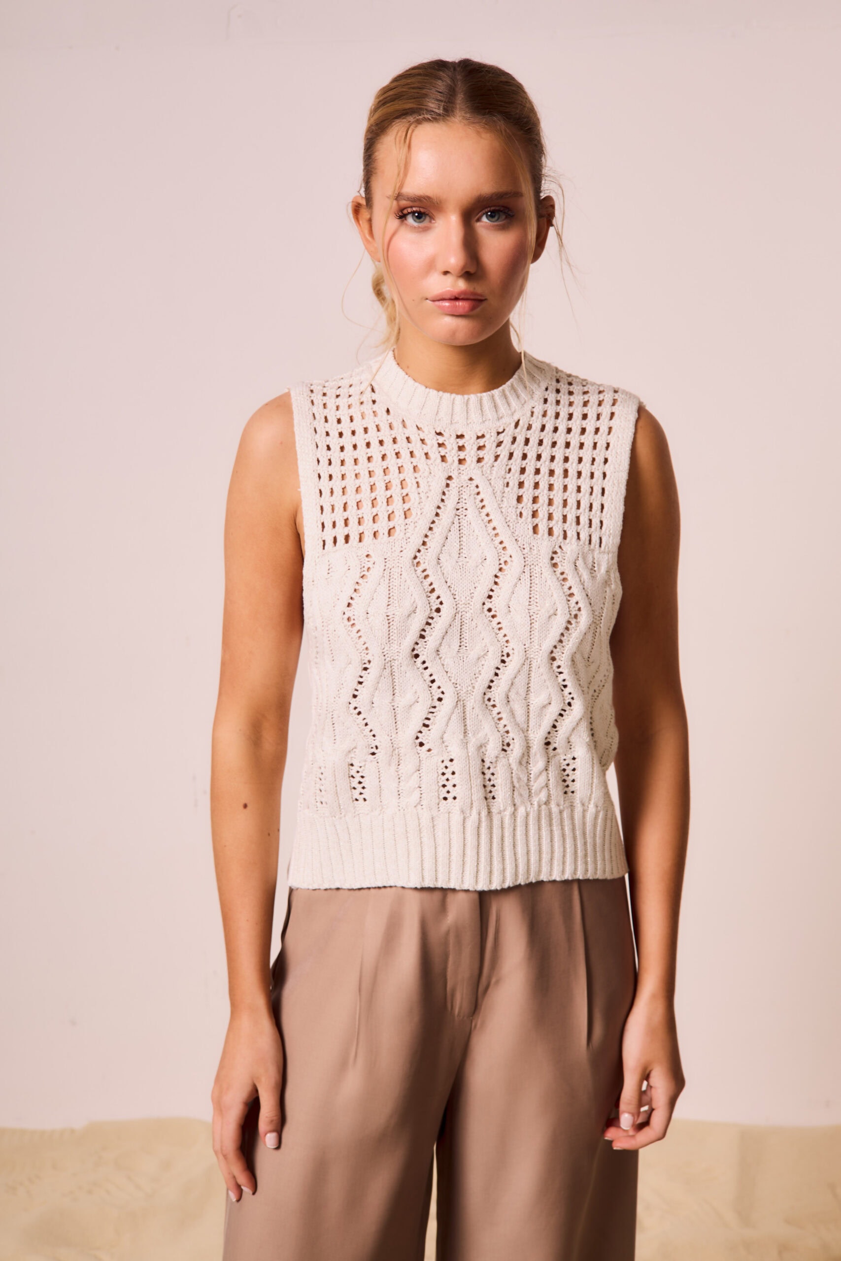 $ 22.000,00Musculosa importada de mujer tejida en punto calado dos agujas con trama de rombos. Tiene punto cerrado rib en cuello, cintura y sisas. Largo modular hasta cintura. Composición 60% Nylon 40% Algodón La modelo está usando talle S color Natural