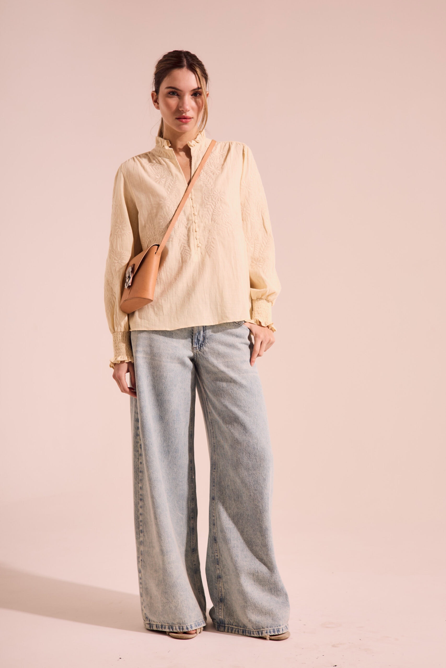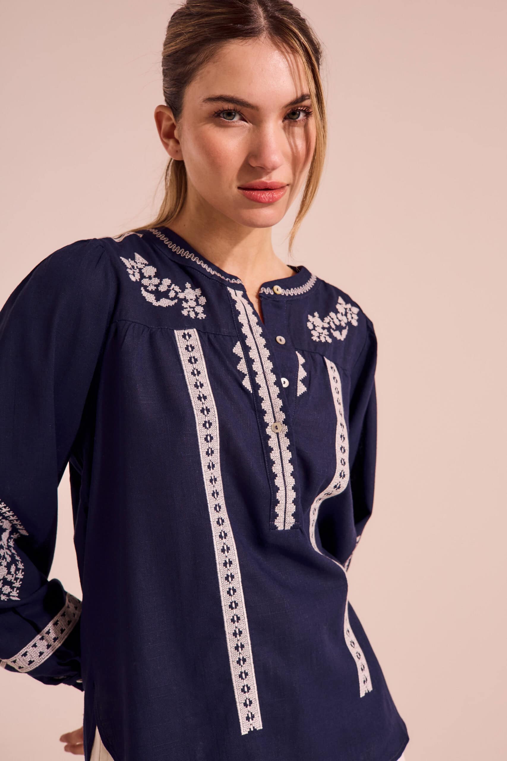 $ 32.000,00Blusa de mujer de calce recto. Lleva mangas largas abullonadas bordadas con diseño floral al tono y puños elásticos bordados. Posee cuello mao con terminación de volados y escote en V con botones tipo pechera forrados en textil base. El delantero tiene bordado un diseño floral al tono. La espalda […]