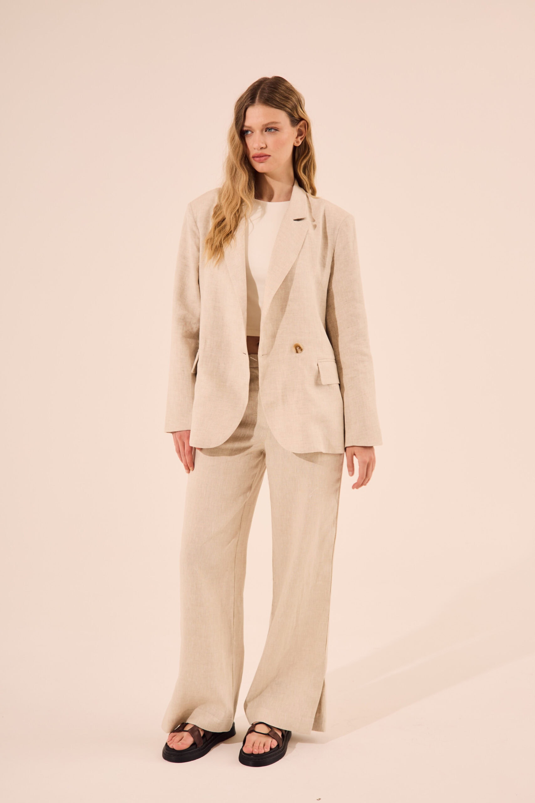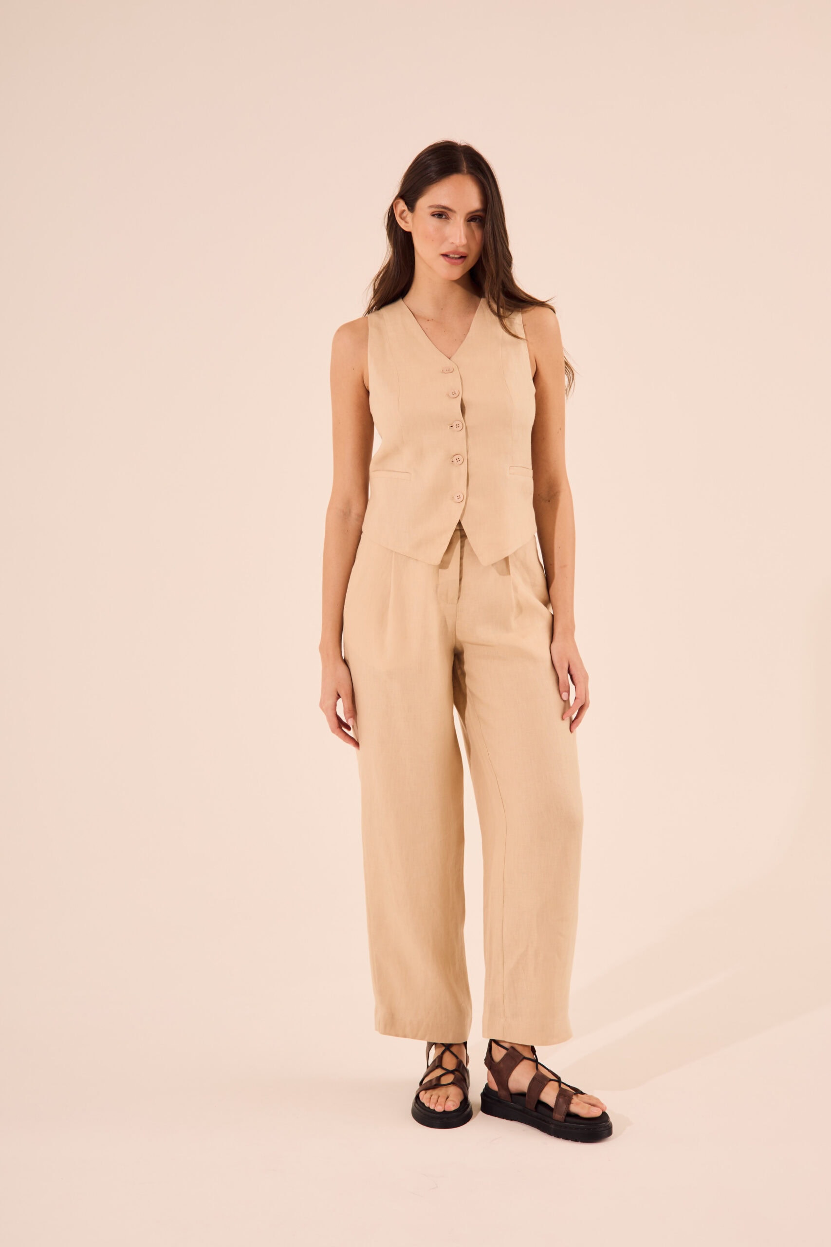 $ 43.000,00Chaleco sastrero de calce recto confeccionado en lino 100%, forrado en tafeta. Largo modular hasta la primera cadera. Posee pinzas al hombro y bolsillos ojal. Escote en V, acceso mediante cinco botones al tono. Composición: 100% Lino Hace conjunto con el Pantalón Art. 2626 La modelo está usando talle S […]