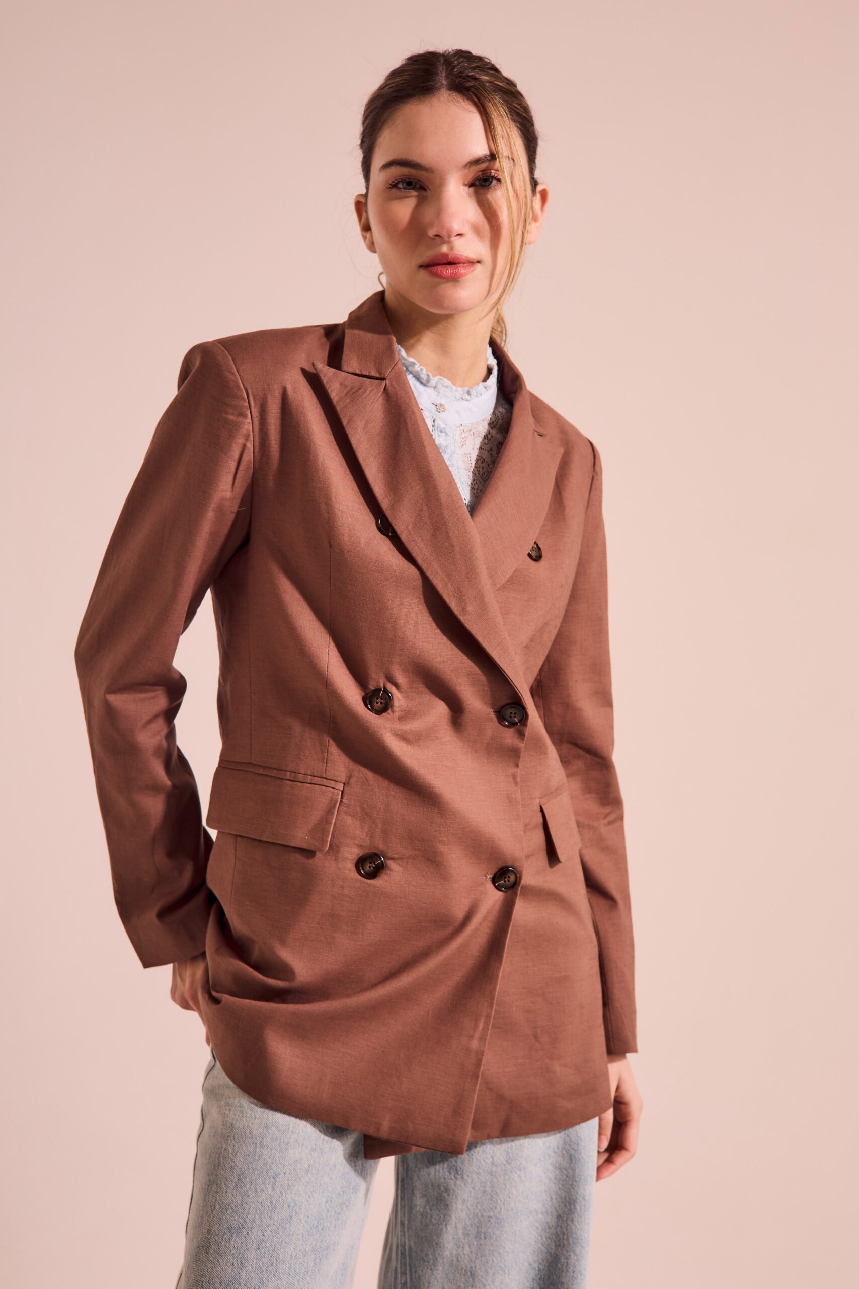 - 15 % Off $ 49.000,00El precio original era: $ 49.000,00.$ 41.650,00El precio actual es: $ 41.650,00.Blazer importada de mujer de calce recto con cuello y solapa con cruces. Lleva seis botones en el delantero al igual que un botón translúcido para cruce interno; los puños llevan cuatro botones de apertura. Lleva pinzas de entalle en delantero y bolsillos ojal con tapa. Tiene traslape en espalda […]