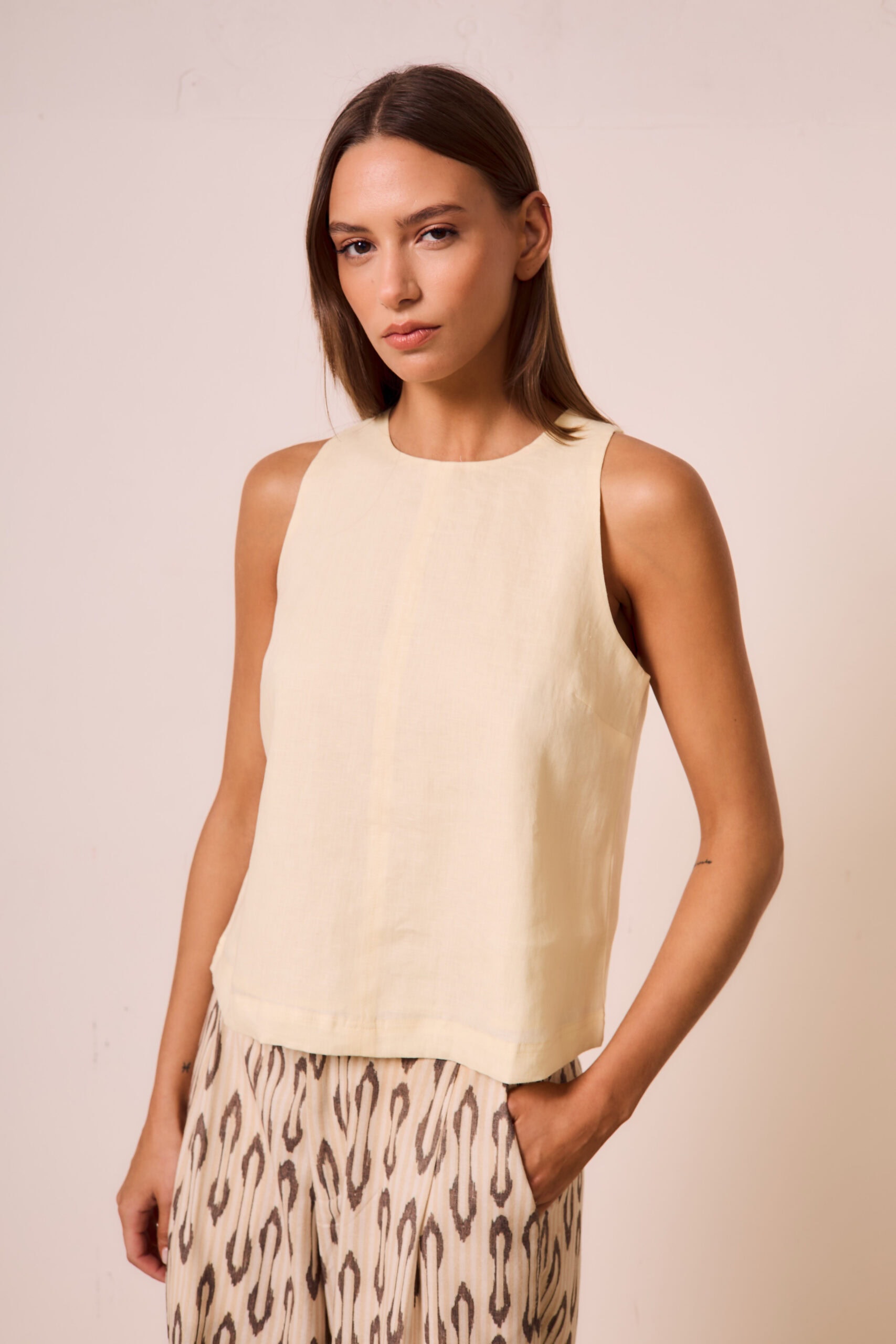 $ 32.000,00Musculosa de calce recto. Posee un recorte central en el delantero y pinzas de busto. En la parte trasera lleva un cierre diente de perro a tono para el acceso. Largo modular hasta primera cadera. Confeccionada en lino 100% y forrada en voile de algodón. Composición Lino 100% La modelo […]