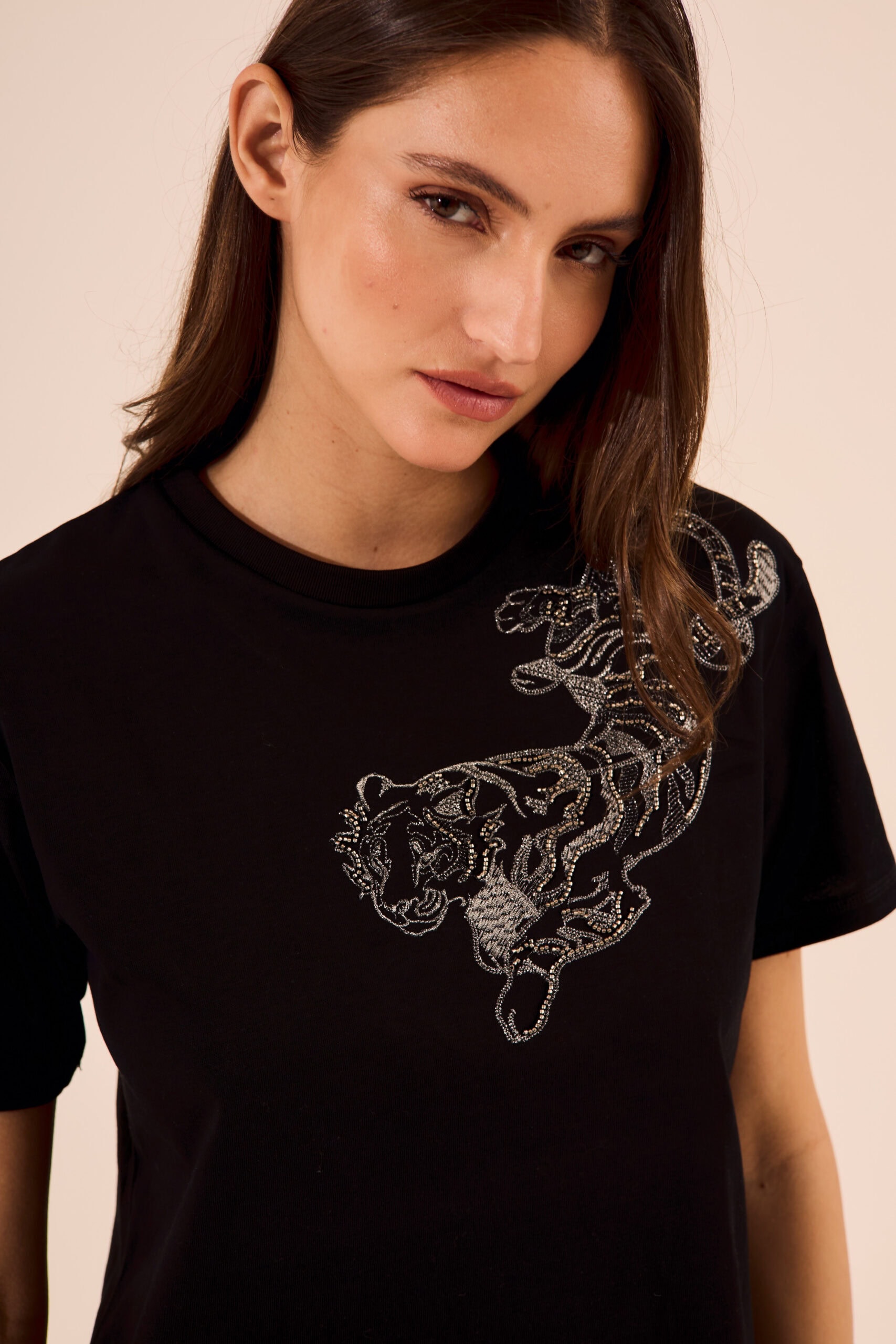 $ 22.000,00Remera de calce recto manga corta. Lleva cuello redondo con complemento rib y diseño de bordado en hilo lúrex con mostacillas. Confeccionado en jersey de algodón. Composición: 100% Algodón La modelo está usando talle S color Negro