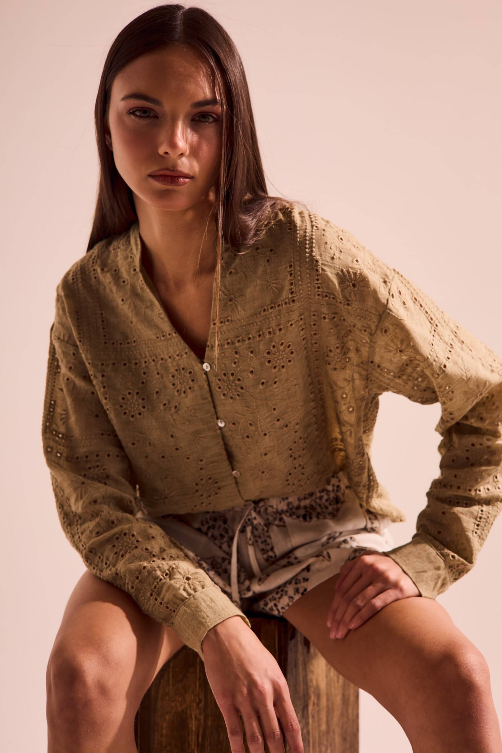 - 15 % Off $ 29.000,00El precio original era: $ 29.000,00.$ 24.650,00El precio actual es: $ 24.650,00.Camisa de calce recto. Posee mangas abullonadas y escote en V con botones forrados. Confeccionada en voile de algodón con broderie con calados, posee detalles de entredos en delantero. Lleva puño con frunces y cierre con botón forrado. Largo modular hasta la primera cadera. Composición 100% Algodón La modelo está […]