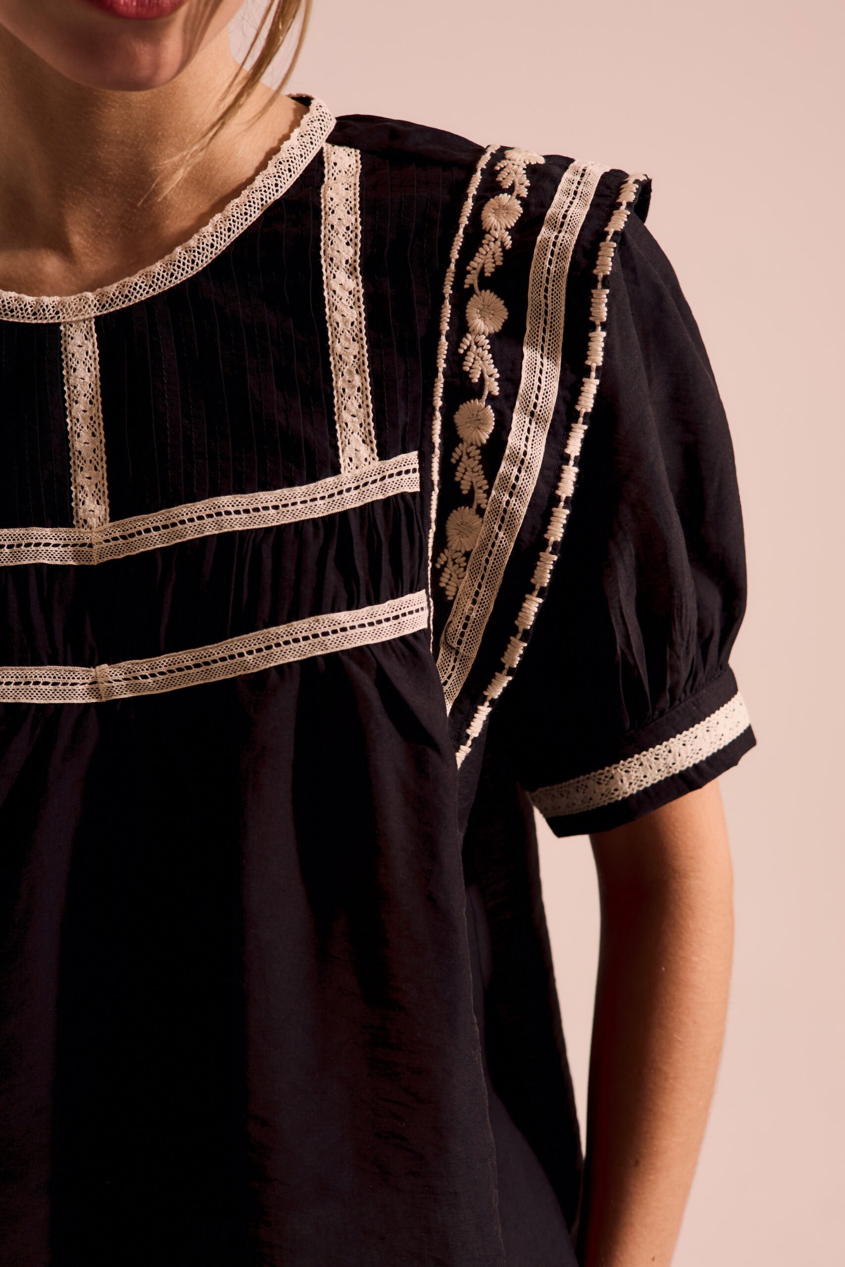 - 15 % Off $ 26.000,00El precio original era: $ 26.000,00.$ 22.100,00El precio actual es: $ 22.100,00.Blusa de calce evasé manga corta con cuello redondo. Detalle de zócalo en sisas con bordado y puntilla. Las mangas son estilo princesa con detalle de puño con puntilla, apertura y botón. La prenda tiene un recorte a la altura del busto con frunces en bajo busto que recorre el […]