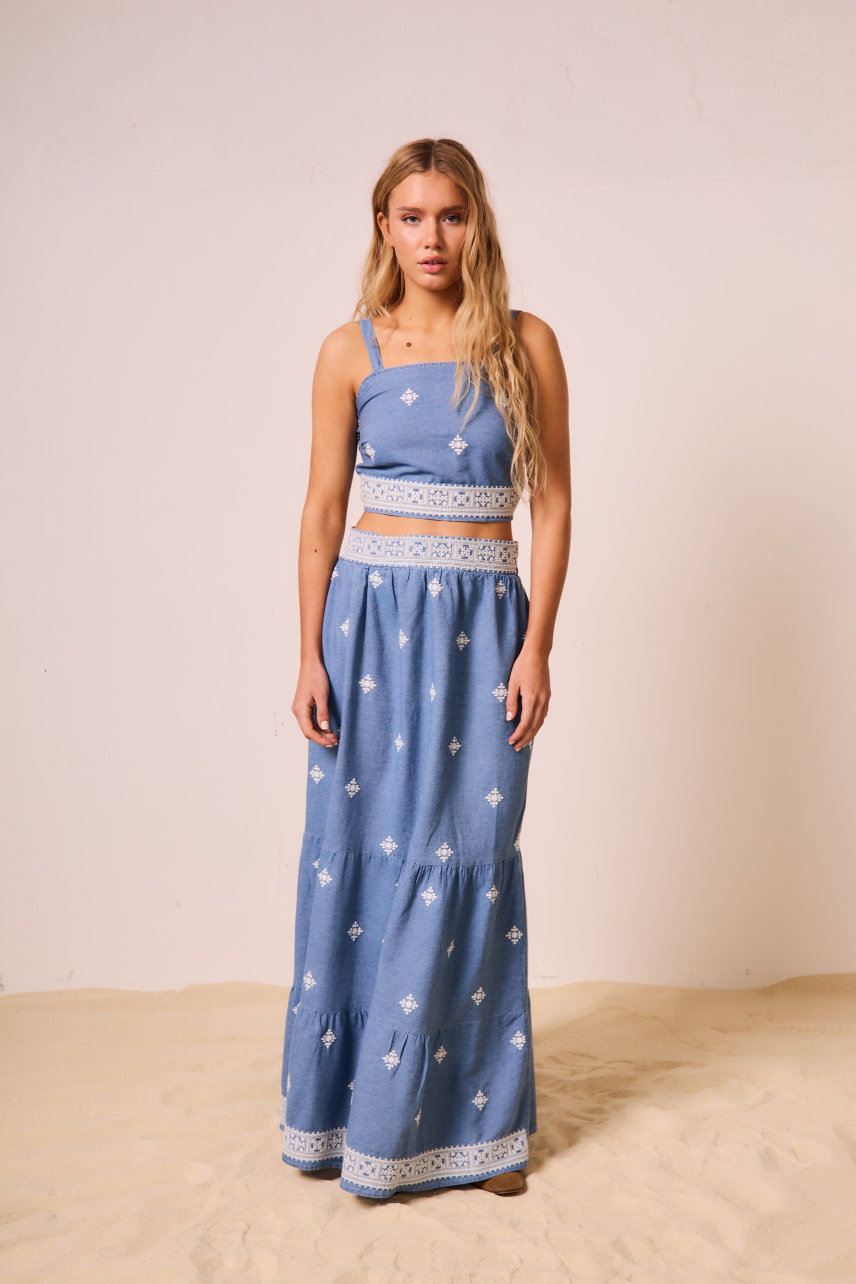 $ 18.000,00Musculosa de calce recto. Lleva bordados a contratono que recorre toda la prenda y zócalo con bordado en ruedo. Lleva espalda elástica. Largo modular arriba de cintura. Confeccionado en denim liviano.