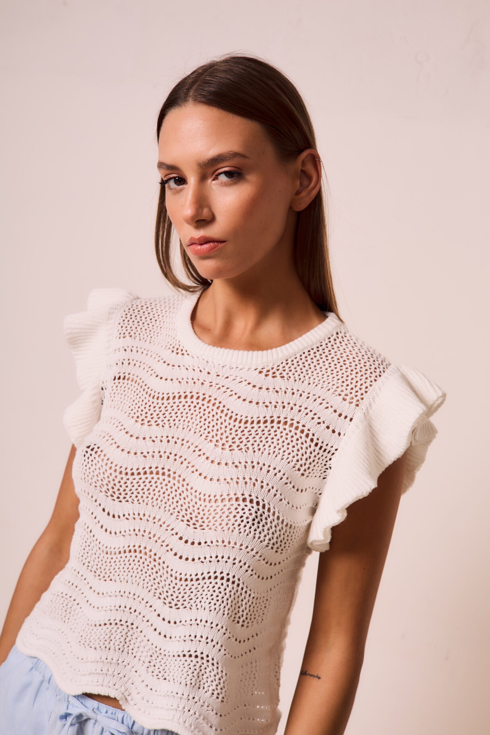 $ 22.000,00Musculosa tejida en punto calado con trama ondulada. Lleva volados supuerpuestos en sisas, cuello redondo y ruedo irregular. Largo modular hasta primera cadera. Composición 60% Nylon 40% Algodón La modelo está usando talle S color Natural
