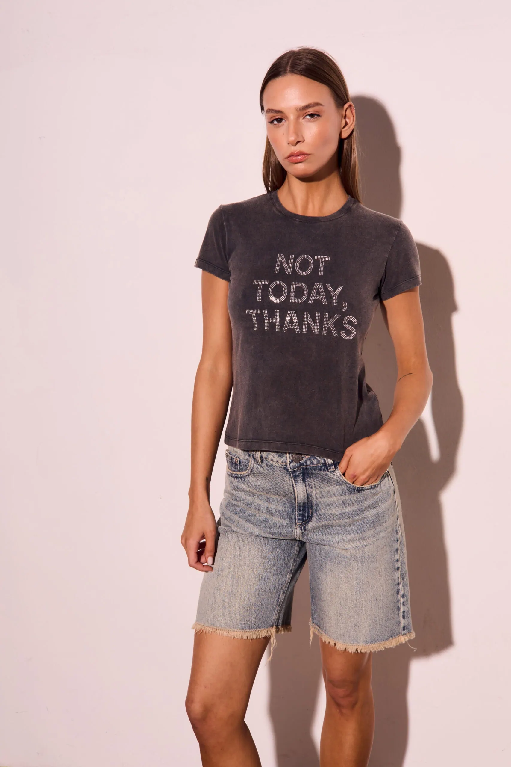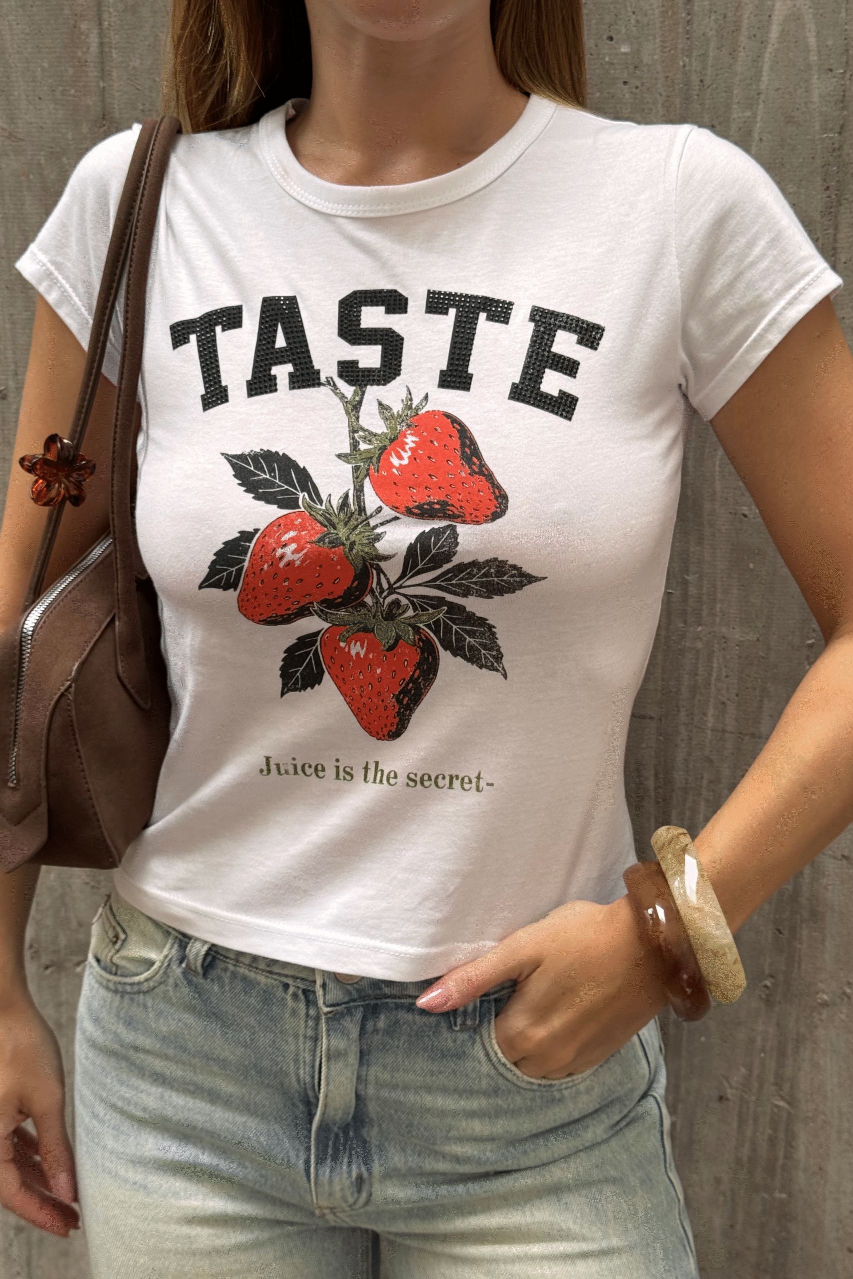 $ 8.900,00Remera baby tee manga corta con estampa y hotfix.