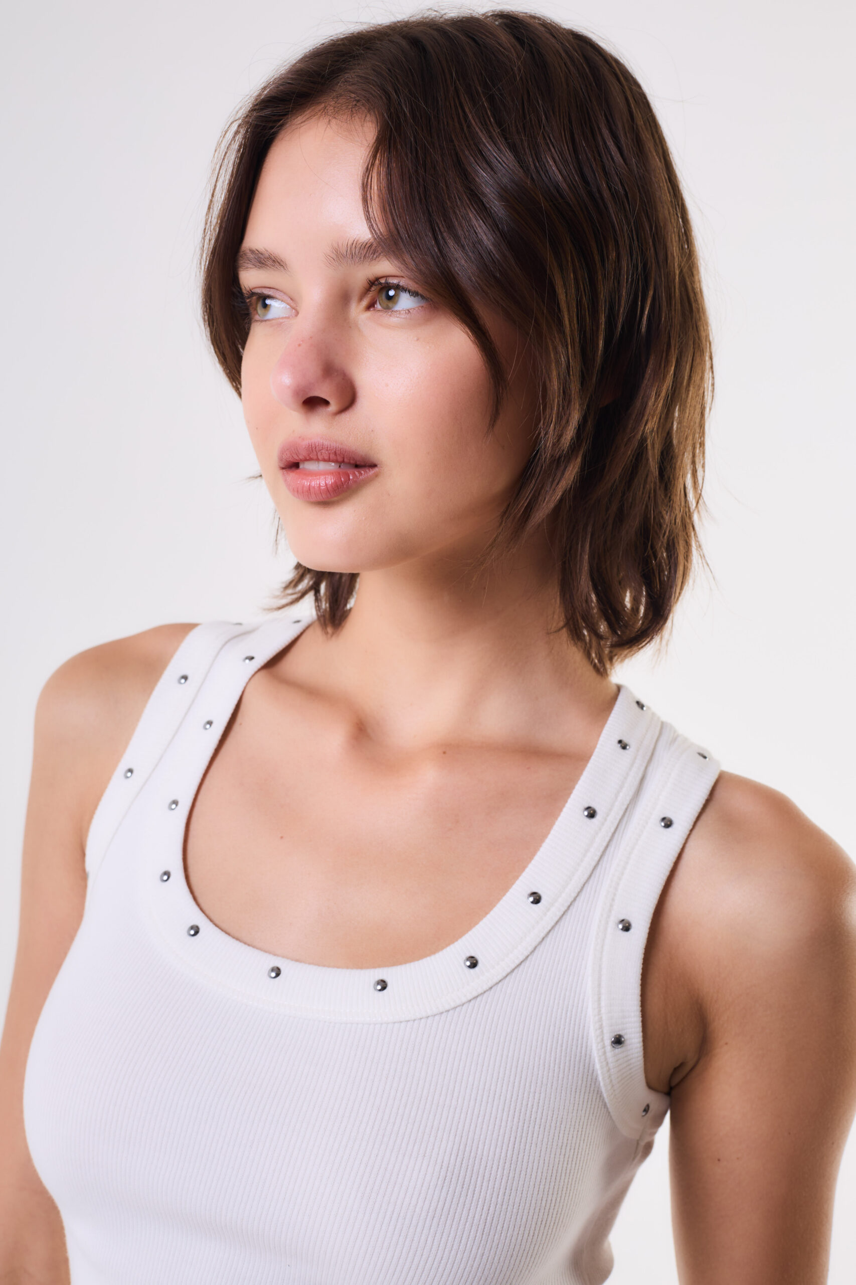 $ 12.000,00Musculosa de calce adherente con collareta ancha y detalle de hotfix tacha en collareta.
