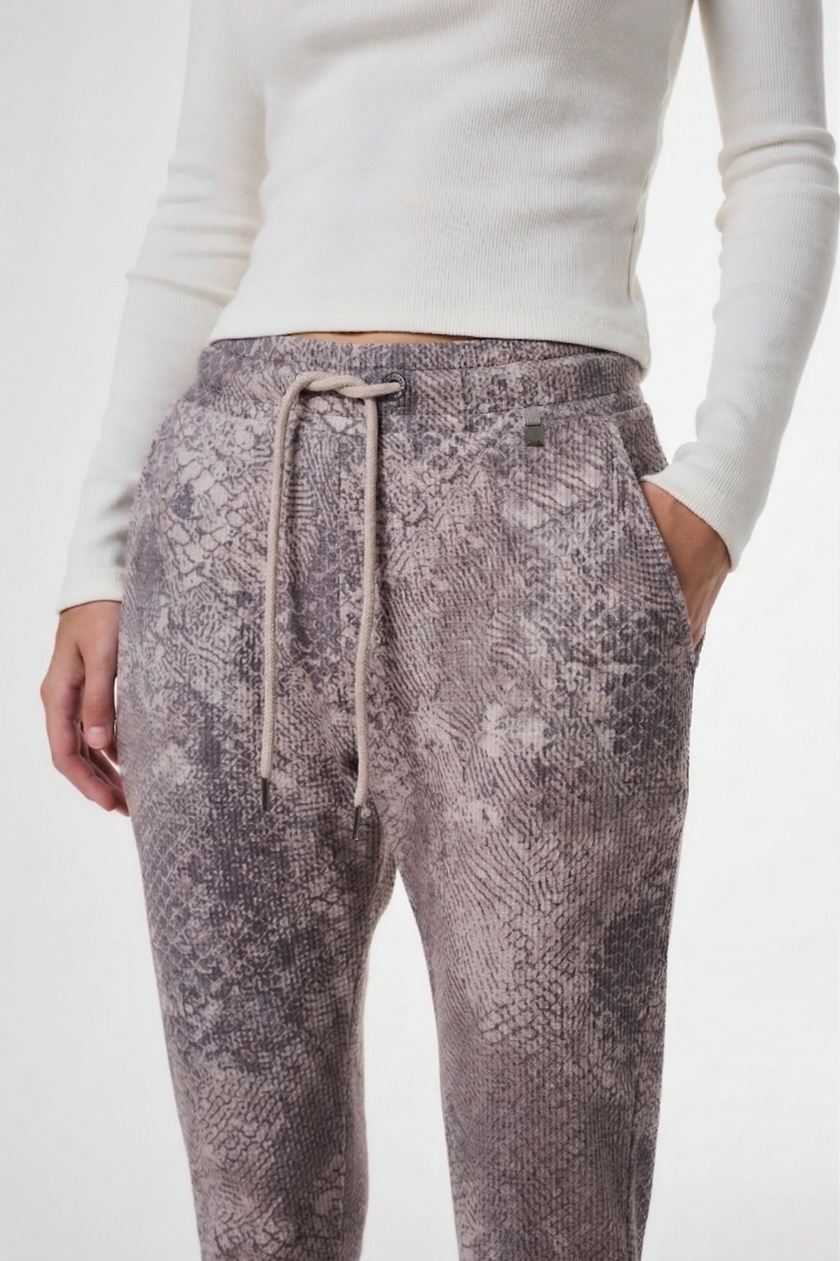 Babucha de mujer con cintura elástica con cordón y ojalillos metalicos y estampa exclusiva en waffle.