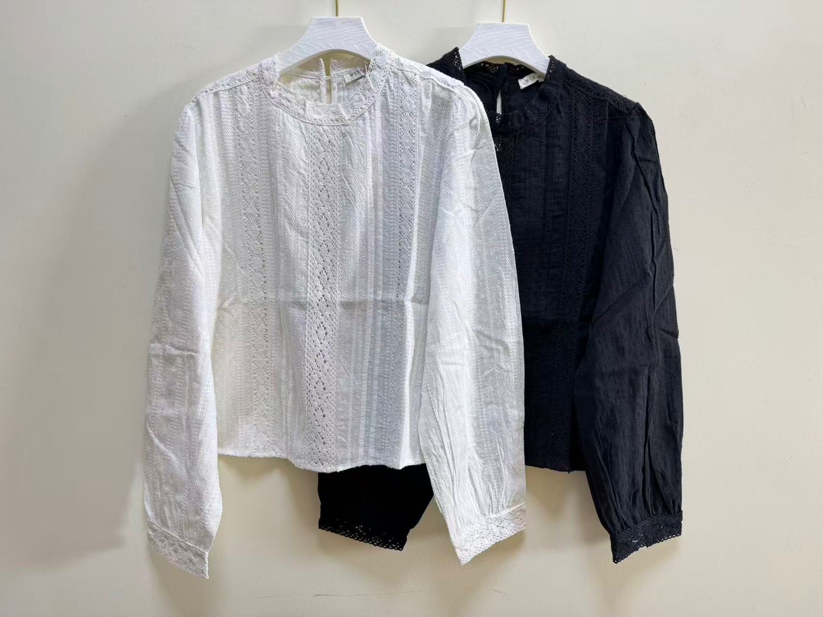 Blusa de mujer importada de calce recto con largo modular hasta la primera cadera, la espalda es levemente más larga que el delantero. La prenda lleva mangas largas abullonadas con detalle de puntilla de algodón al tono en puños y cruce con botón. Además, el delantero lleva puntillas de algodón al tono en el centro delantero, laterales y hombros. También, el delantero posee alforzas que recorren el delantero de manera vertical. El cuello es subido y con la misma puntilla de algodón de terminación. Se concede acceso a la prenda mediante gota y botón en centro de espalda. La prenda está confeccionada en voile de algodón plumeti diferenciado.