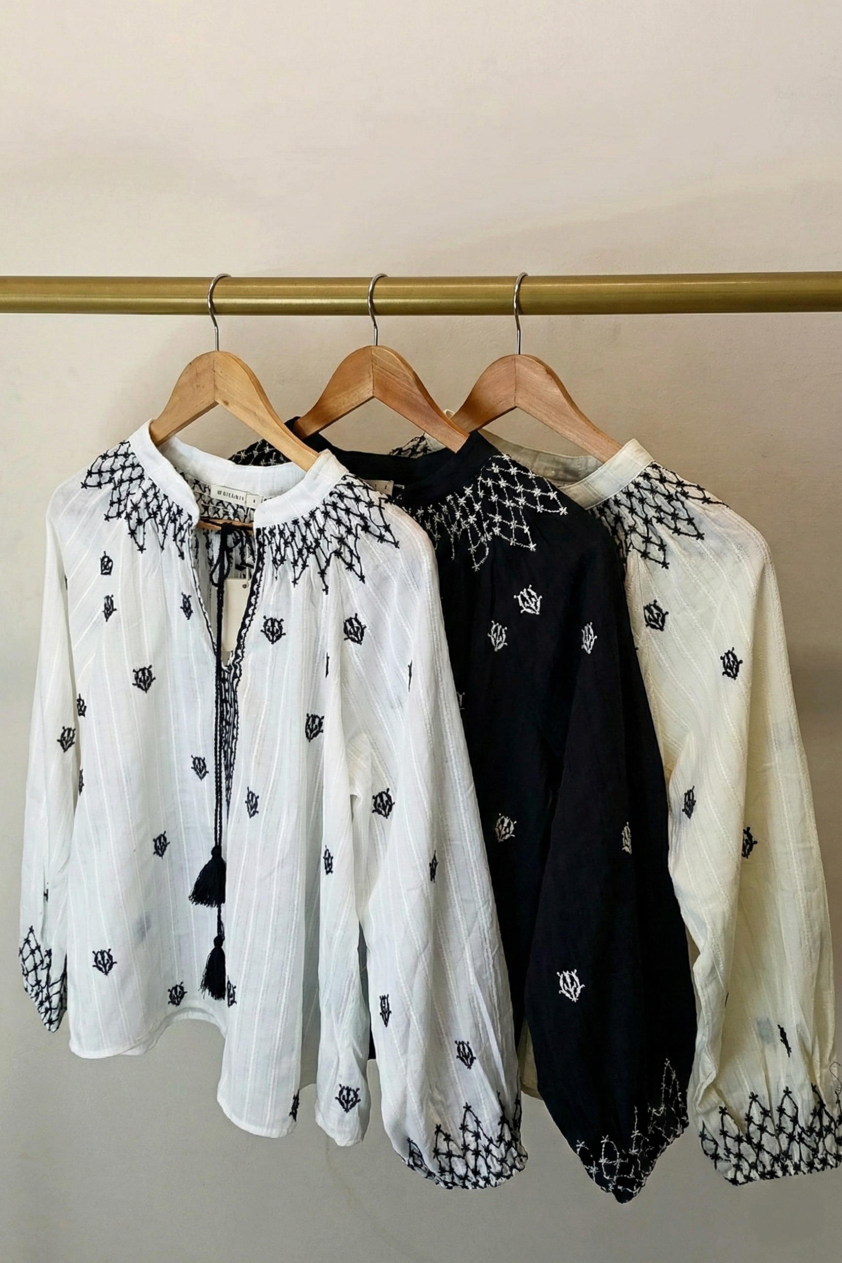 Blusa importada de mujer de calce recto. Lleva mangas abullonadas con puño elástico. La prenda lleva cuello mao y escote en V con detalle de cordón en el cuello a contratono con terminación de borlas. La prenda está confeccionada en voile rattier de algodón con detalle de bordados a contratono que recorren toda la prenda, con bordado tramado en centro delantero. Largo modular hasta segunda cadera. Composición: 100% Algodón.
