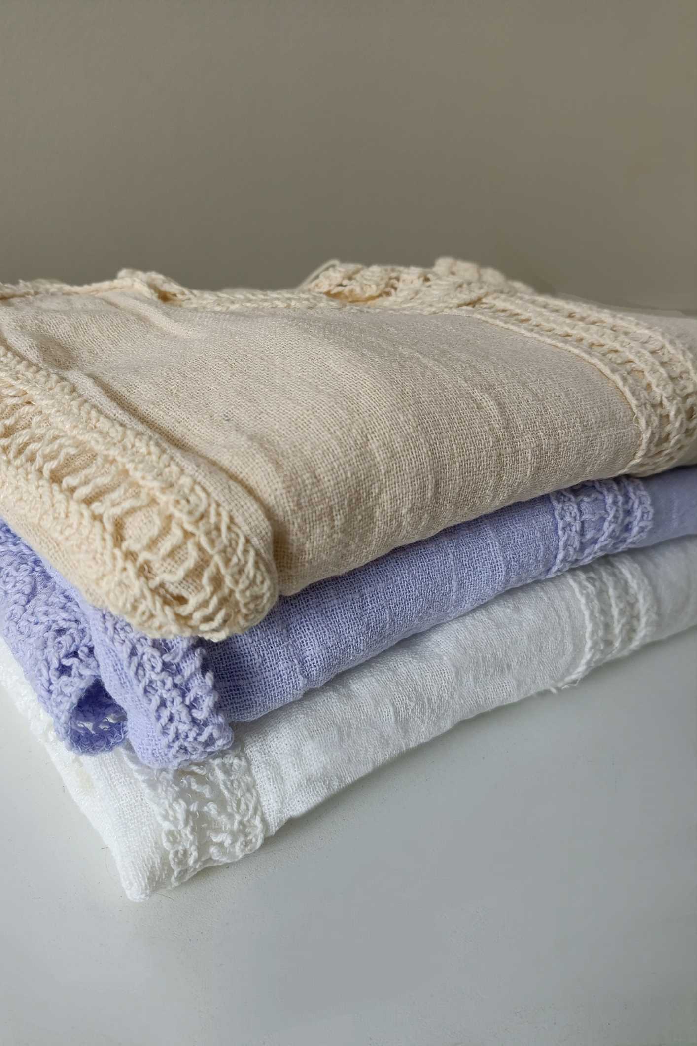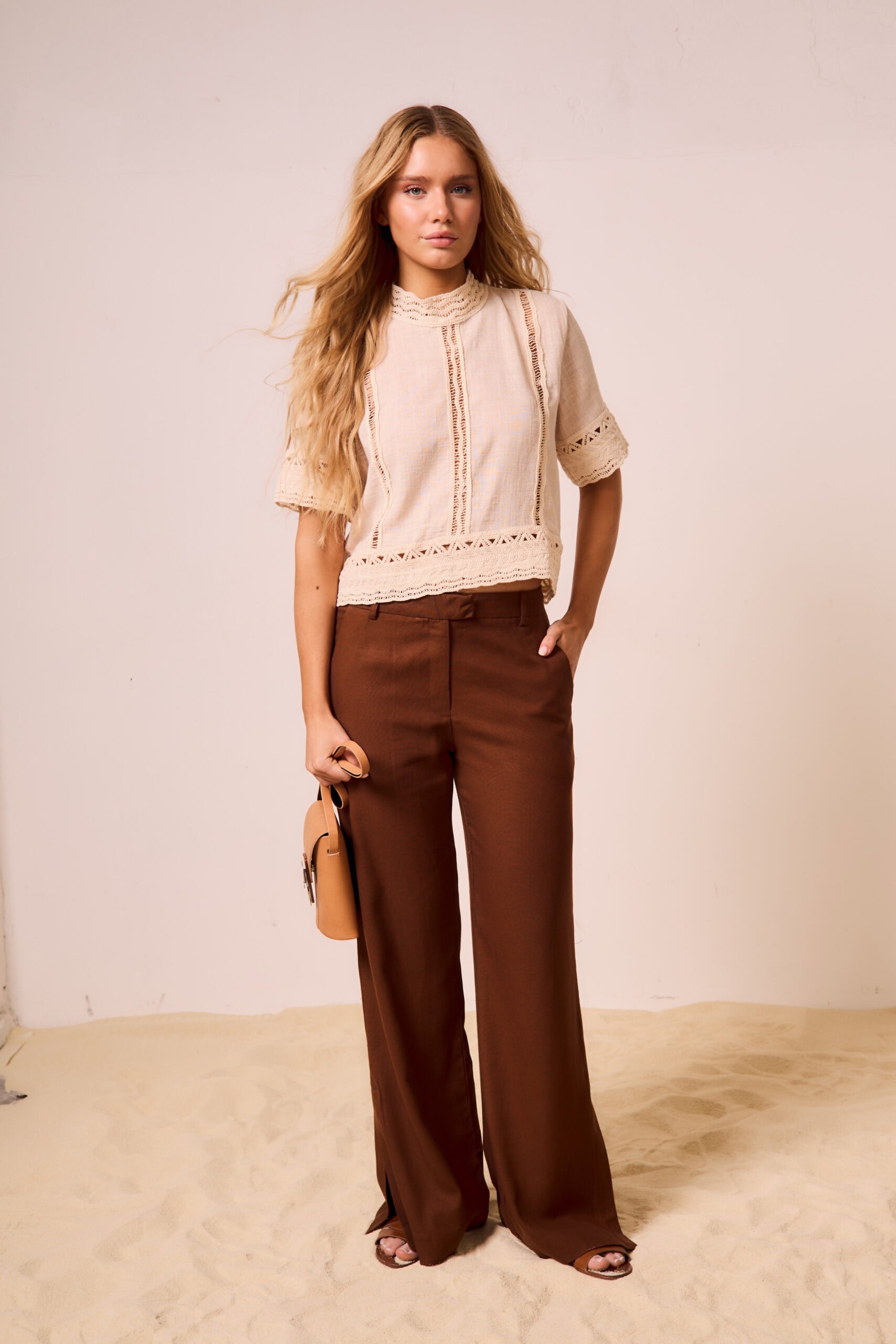 Blusa importada de mujer de calce oversize manga corta. Lleva puntilla ancha en terminaciones de ruedo, mangas y cuello. Detalle de entredos al tono en delantero. Largo modular hasta primera cadera. Acceso mediante cartera de botones oculta que recorre el centro de espalda. Confeccionado en cey de algodón.