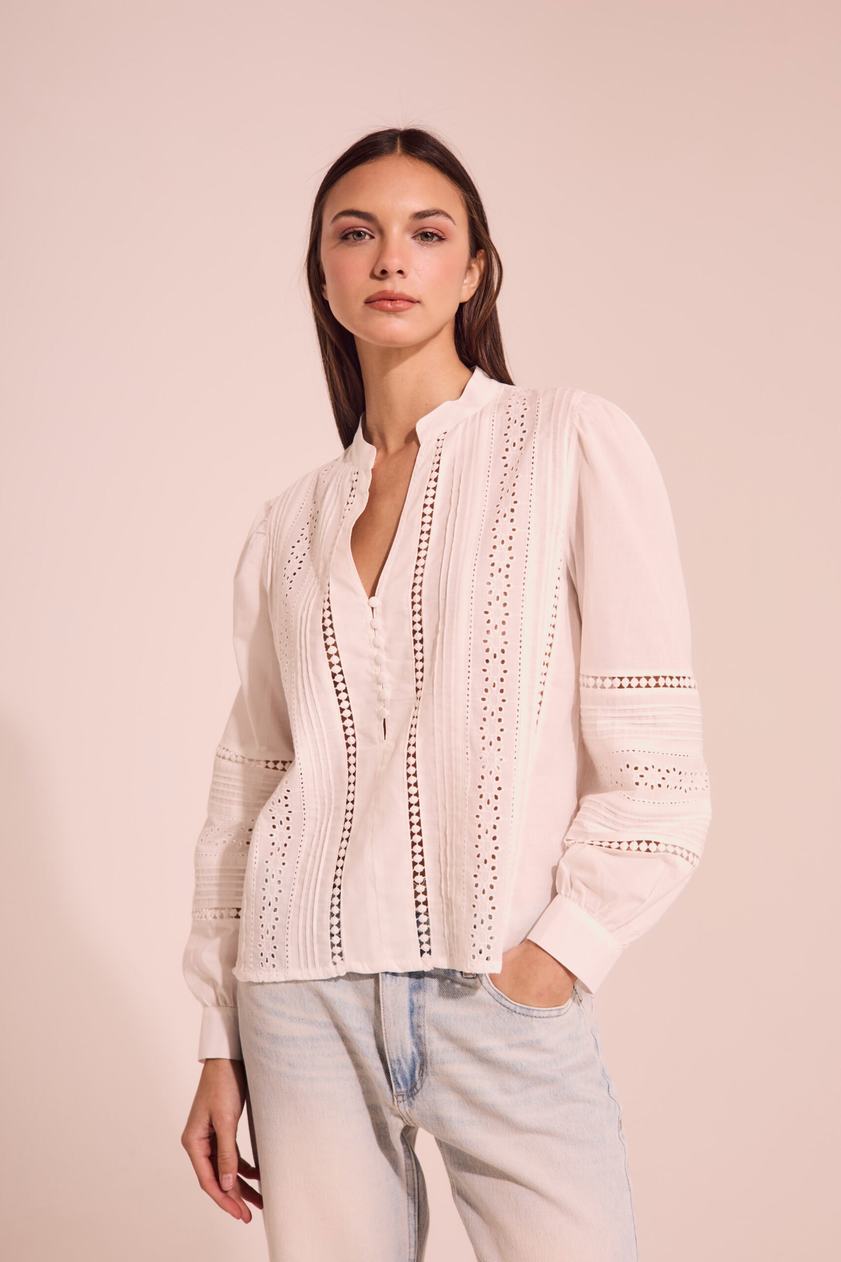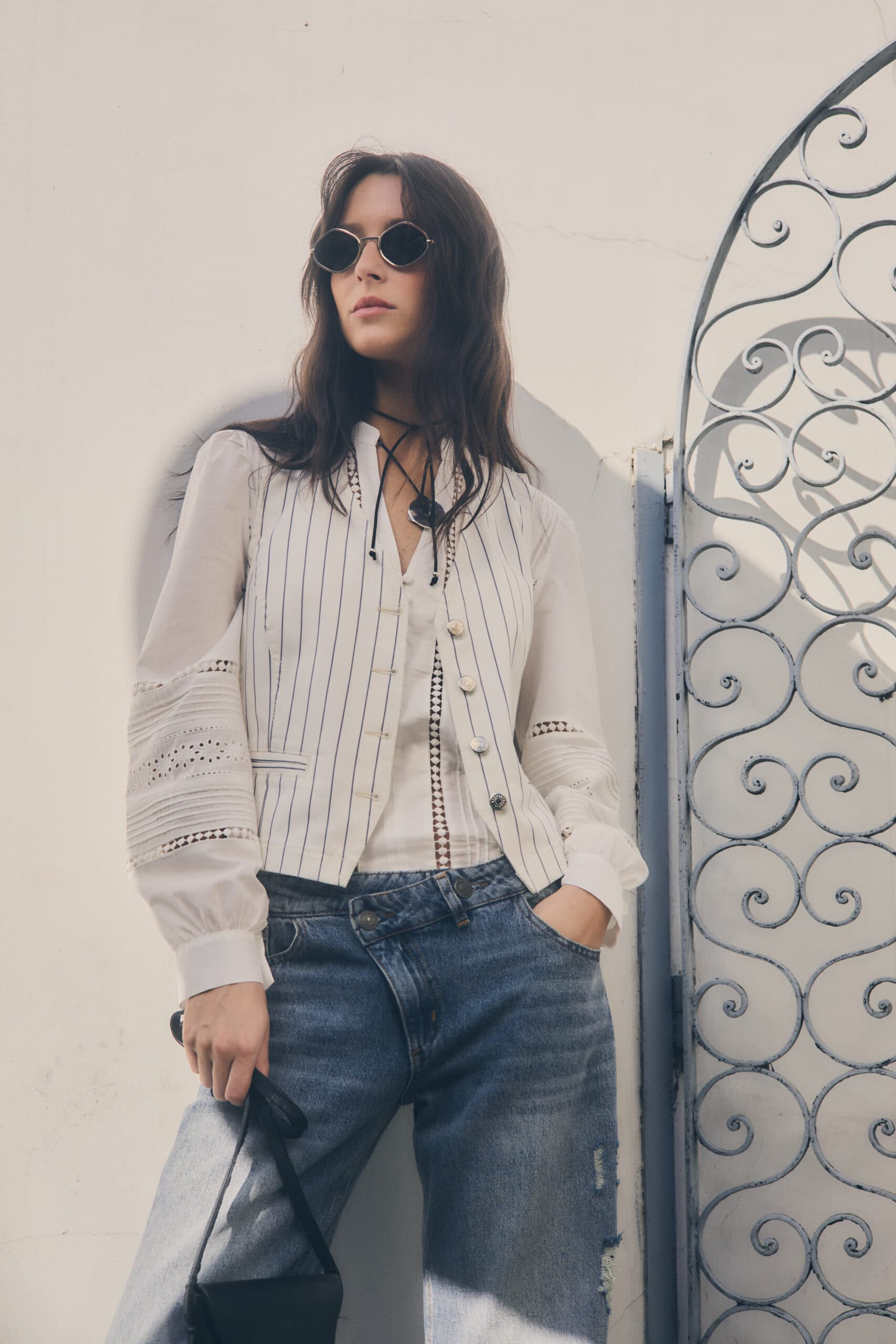 Blusa de calce holgado manga larga. Lleva mangas abullonadas con tirilla con botón. Lleva cuello mao con cartera de botones pechera, con botones de pie forrados del textil base. La camisa tiene entredos, alforzas, y bordados calados que recorren el delantero y las mangas. Detaññe de chapita niquel personalizada de la marca en espalda. Largo modular hasta primera cadera. Confeccionado en voile de algodón.