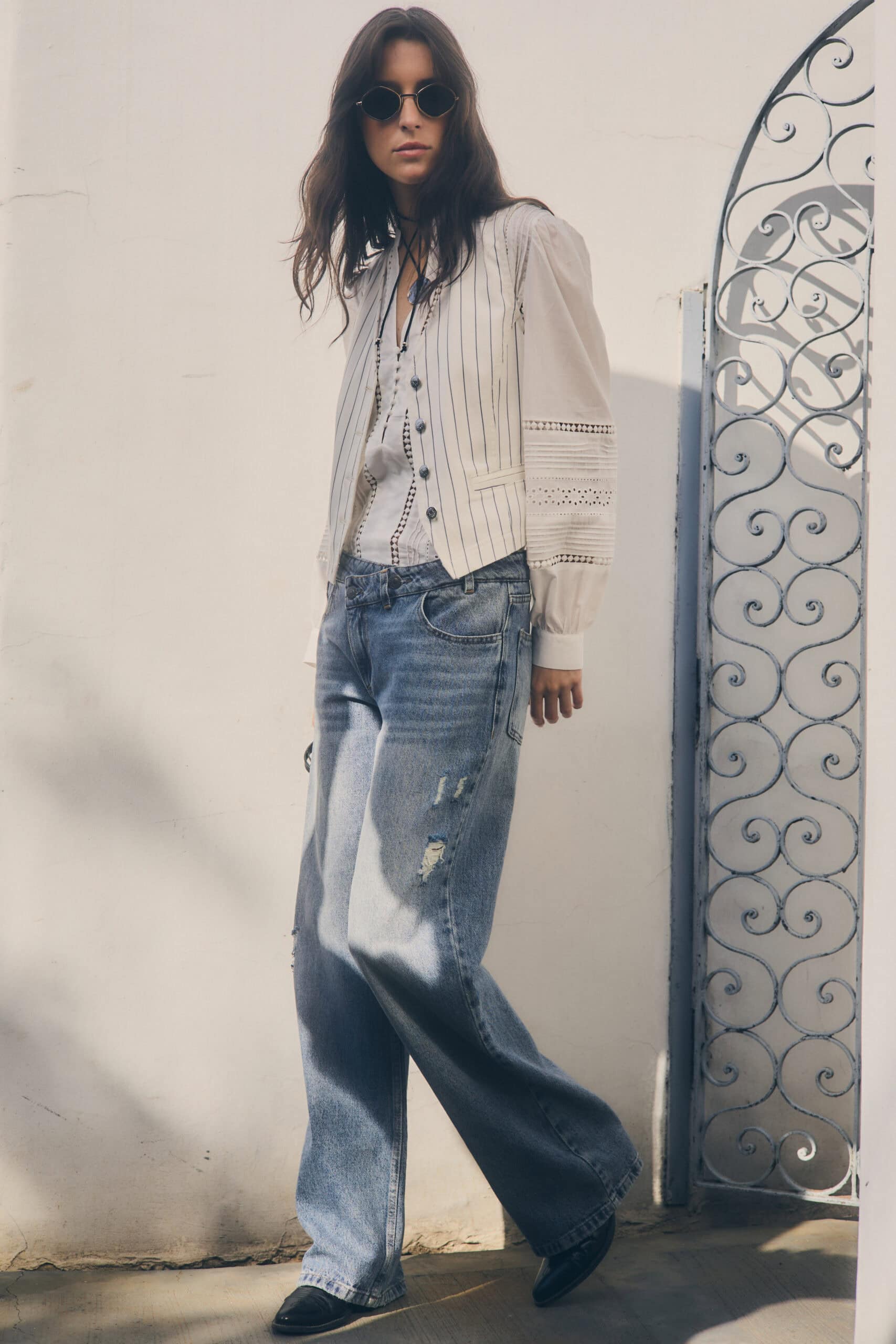 Blusa de calce holgado manga larga. Lleva mangas abullonadas con tirilla con botón. Lleva cuello mao con cartera de botones pechera, con botones de pie forrados del textil base. La camisa tiene entredos, alforzas, y bordados calados que recorren el delantero y las mangas. Detaññe de chapita niquel personalizada de […]