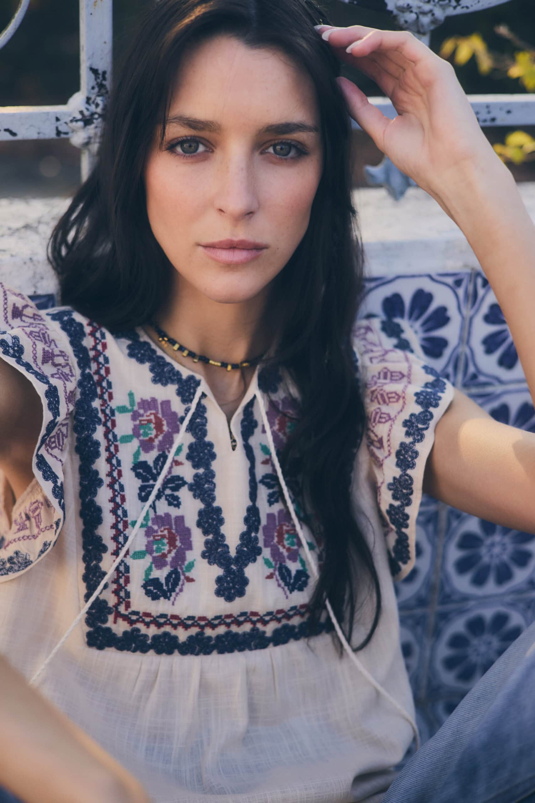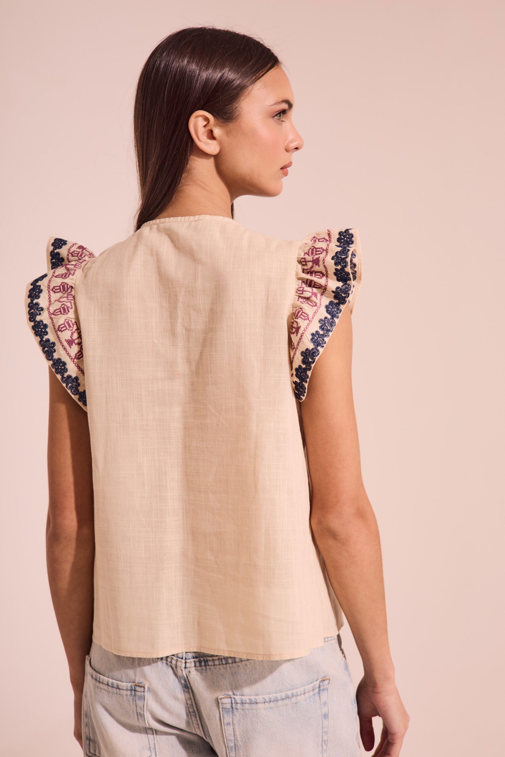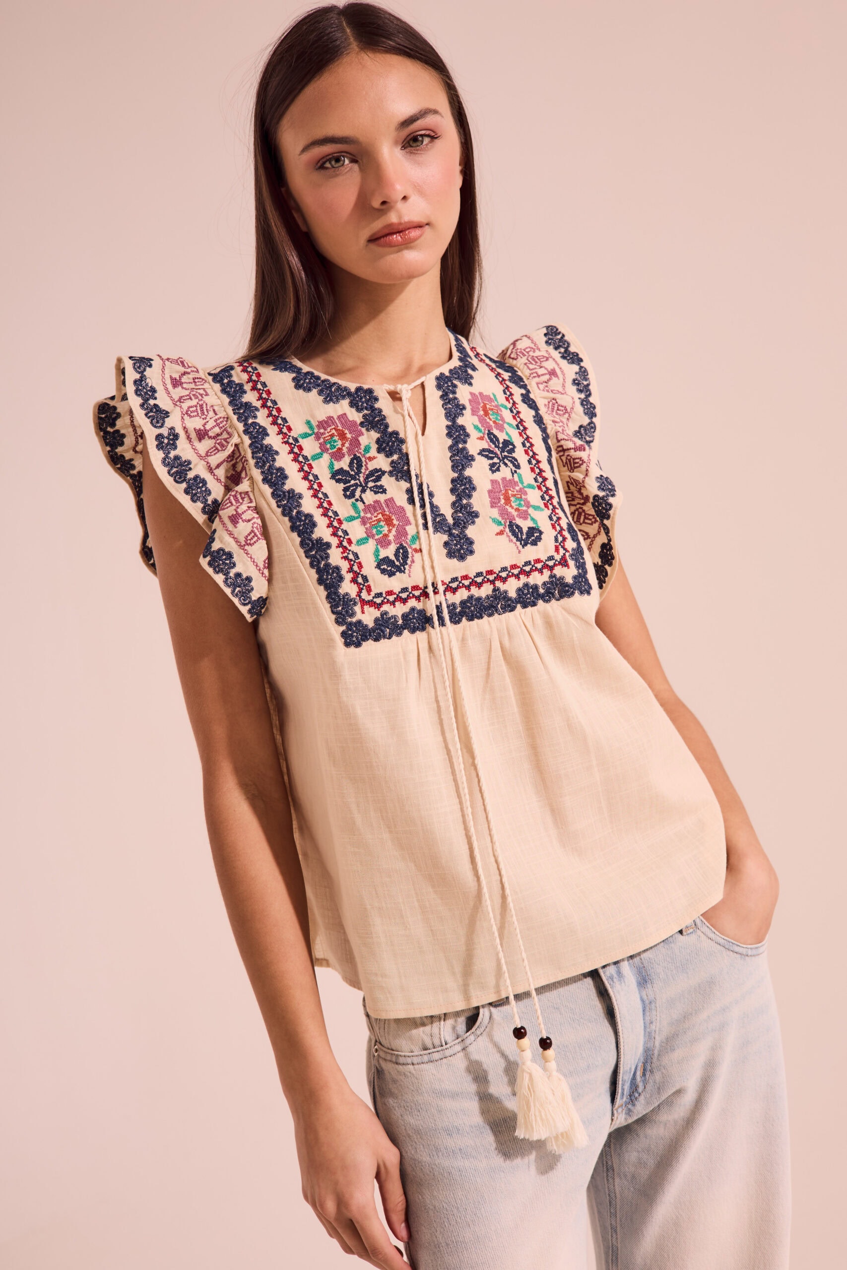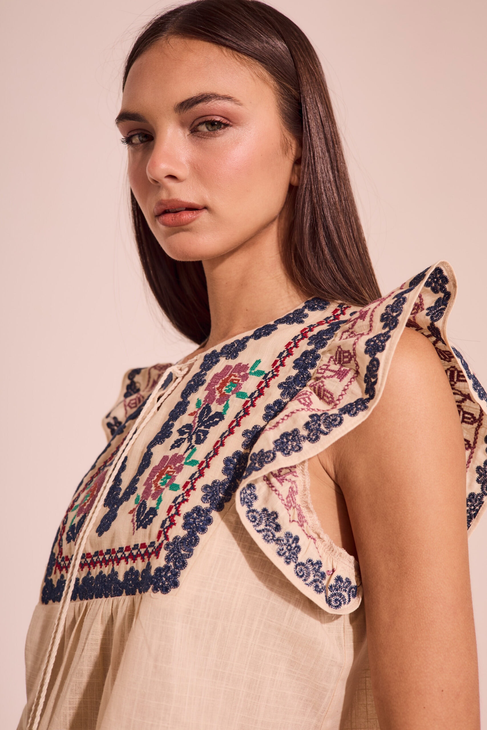 Blusa importada de mujer de calce recto sin mangas. Lleva volados en sisas con detalle de bordado en trama de flor y bordado con técnica de cruz. Lleva cuello redondo con escote en pico, con dos cordones con borlas al tono y terminales de madera en dos tonos.El delantero lleva un diseño de bordado tipo pechera, que recorre el los hombros hasta la altura del busto. El bordado lleva cinco colores y técnica de cruz. Largo modular hasta primera cadera. Confeccionado en voile de algodón slub.