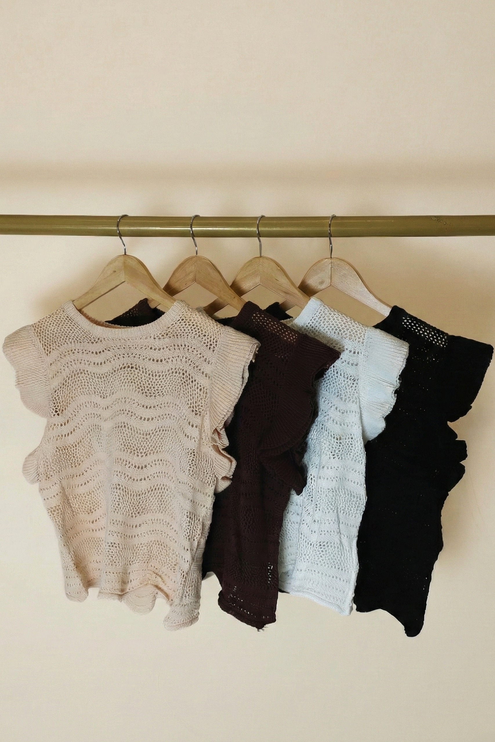 Musculosa tejida en punto calado con trama ondulada. Lleva volados supuerpuestos en sisas, cuello redondo y ruedo irregular. Largo modular hasta primera cadera.