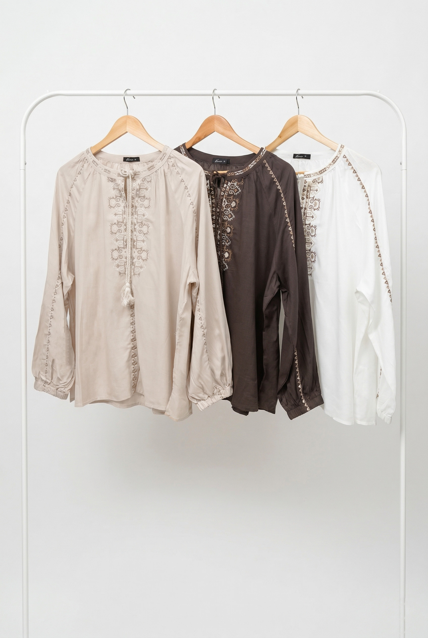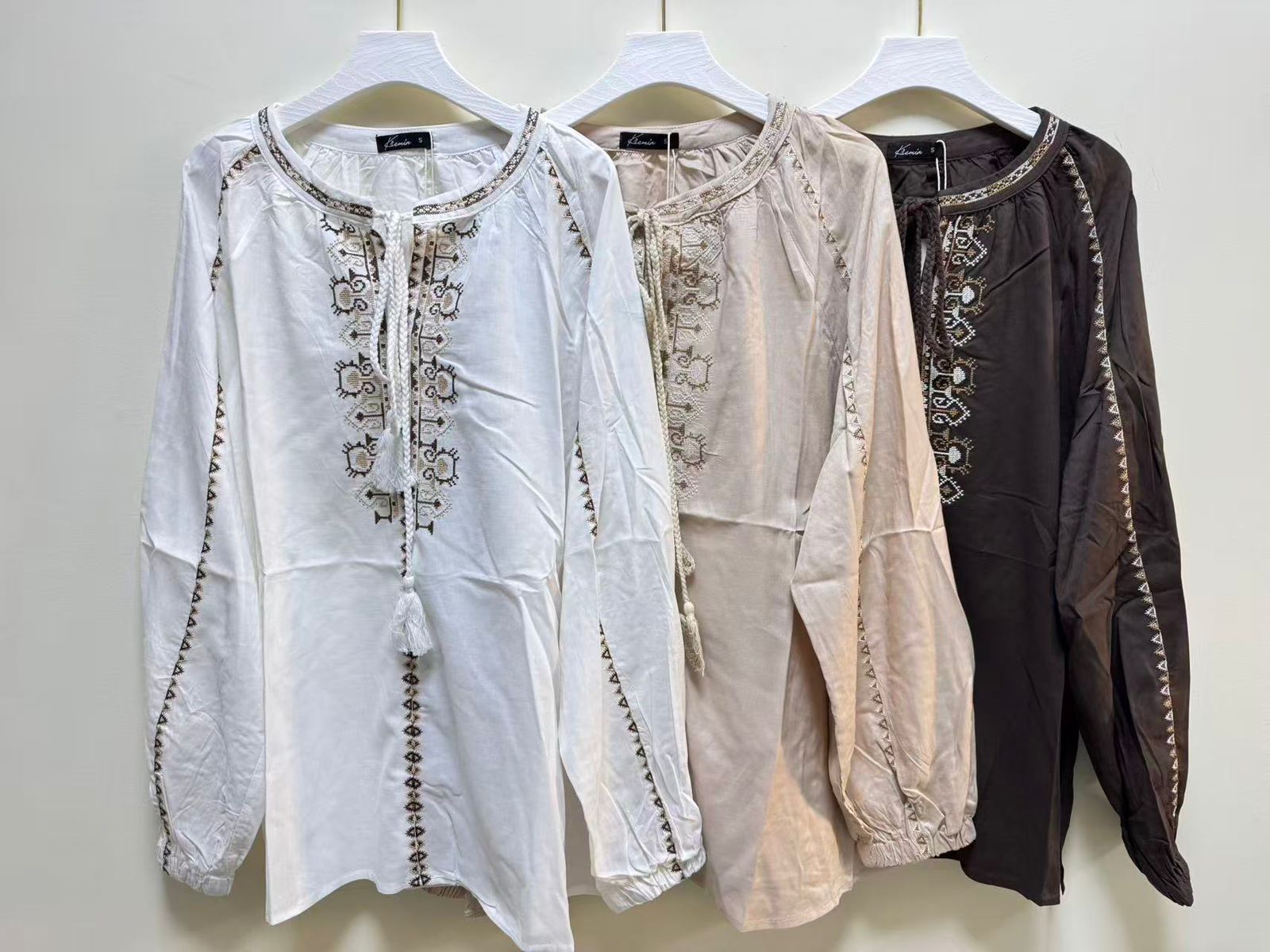 Blusa de mujer importada de calce holgado con largo modular hasta la segunda cadera. Lleva mangas largas raglán abullonadas, con puño elástico. Además, posee cuello mao con bordado de punto cruz de dos colores que recorre todo el mismo. También, se encuentran lazos trenzados con borlas al tono en la terminación de cuello. La prenda tiene un diseño de bordado de punto cruz en el centro delantero y en las mangas. Los laterales llevan unos pequeños tajos. La prenda está confeccionada con un voile rayón-lino.