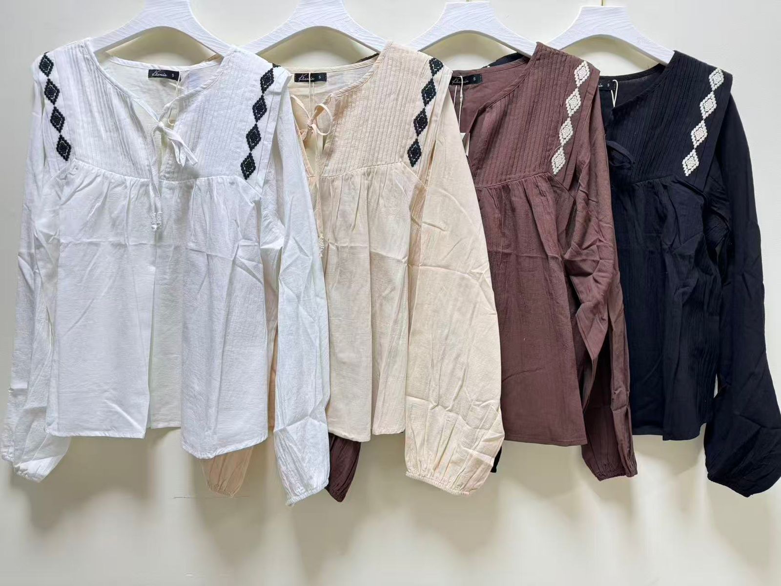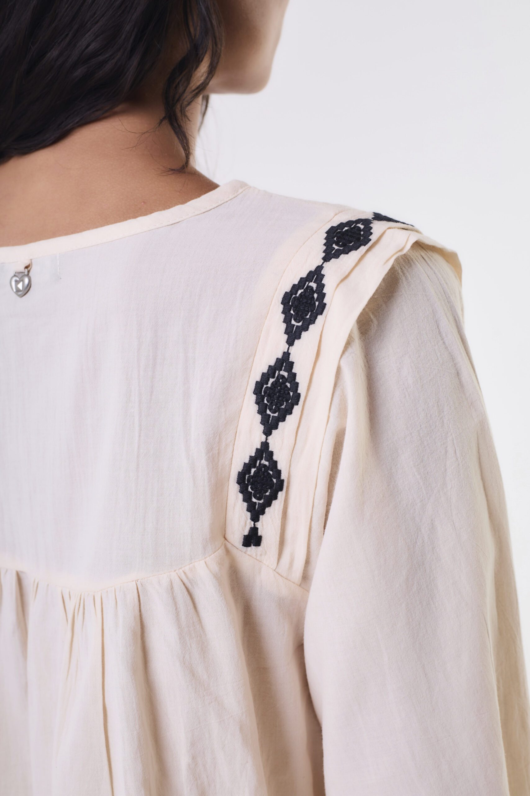Blusa de mujer importada de calce holgado con largo modular hasta la primera cadera. La prenda posee mangas largas abullonadas, con puños elásticos. Además, la prenda se distingue por tener en el delantero un recorte a la altura de los hombros con alforzas y zócalos superpuestos en los hombros, un zócalo lleva un bordado a contratono. El bajo recorte posee frunces. La blusa lleva escote en V, con lazos del género base en el escote para atar. También, la espalda tiene un canesú con frunces debajo del mismo, y una chapita personalizada en el centro del cuello. La prenda está confeccionada en voile de algodón.