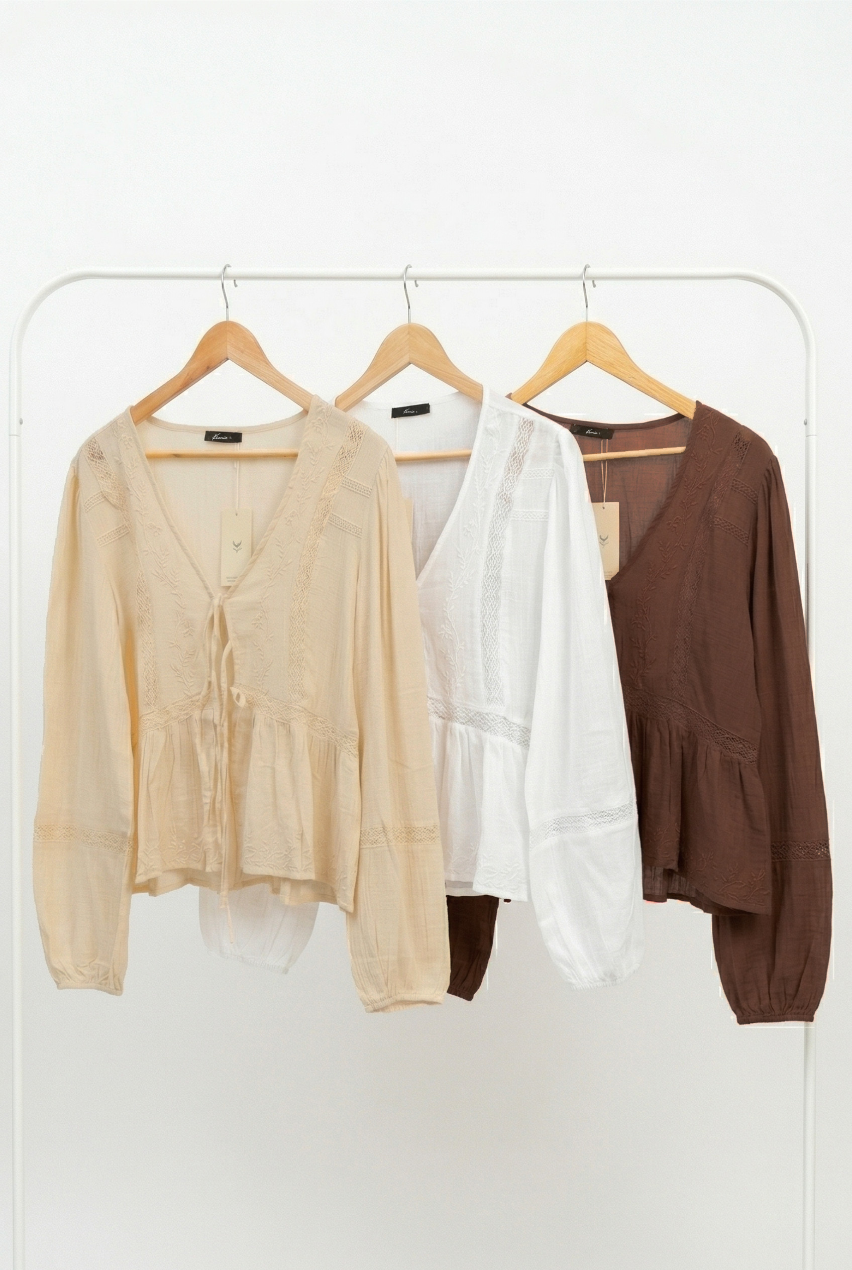 Camisa de mujer importada de calce recto. Tiene mangas largas abullonadas con detalle de entredos y puños elásticos. Posee escote en V, entredos y bordados al tono en hombros. Además, tiene entredos en cintura, generando un recorte con volados en ruedo. El largo modular es hasta primera cadera. Se concede acceso a la prenda mediante dos lazos en el textil base en el centro delantero. Confeccionado en algodón slab.