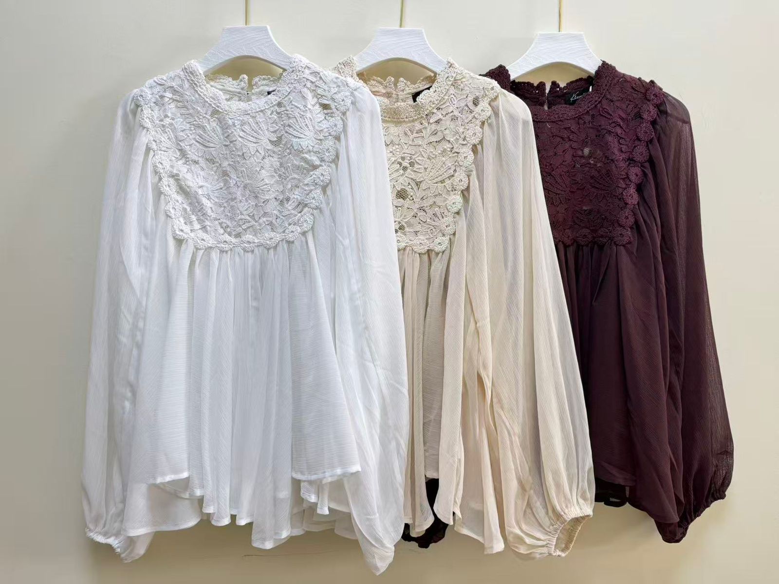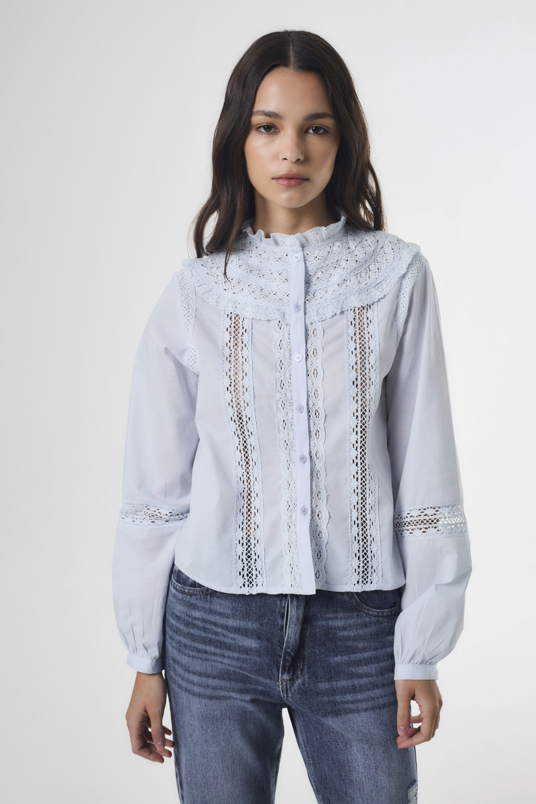 Blusa importada de mujer de calce evasé, con largo modular hasta la segunda cadera. Lleva mangas largas abullonadas con puño elástico. Además, posee cuello redondo subido con terminación de puntilla al tono. Tanto la espalda como el delantero llevan recortes pechera, con un encaje de algodón en el recorte. El bajo recorte tiene un gran frunce que genera mucho volumen. Se concede acceso a la prenda mediante gota con un botón nacarado. La prenda está confeccionada en una gasa con mucha caída, con una vista interna de gasa.