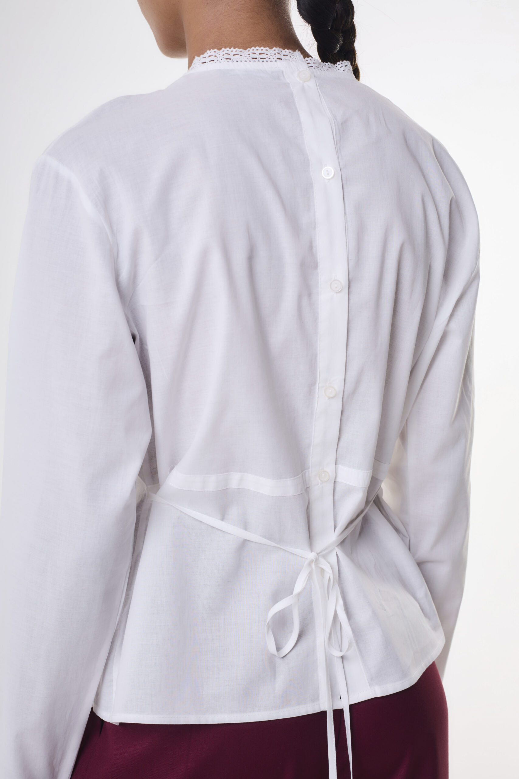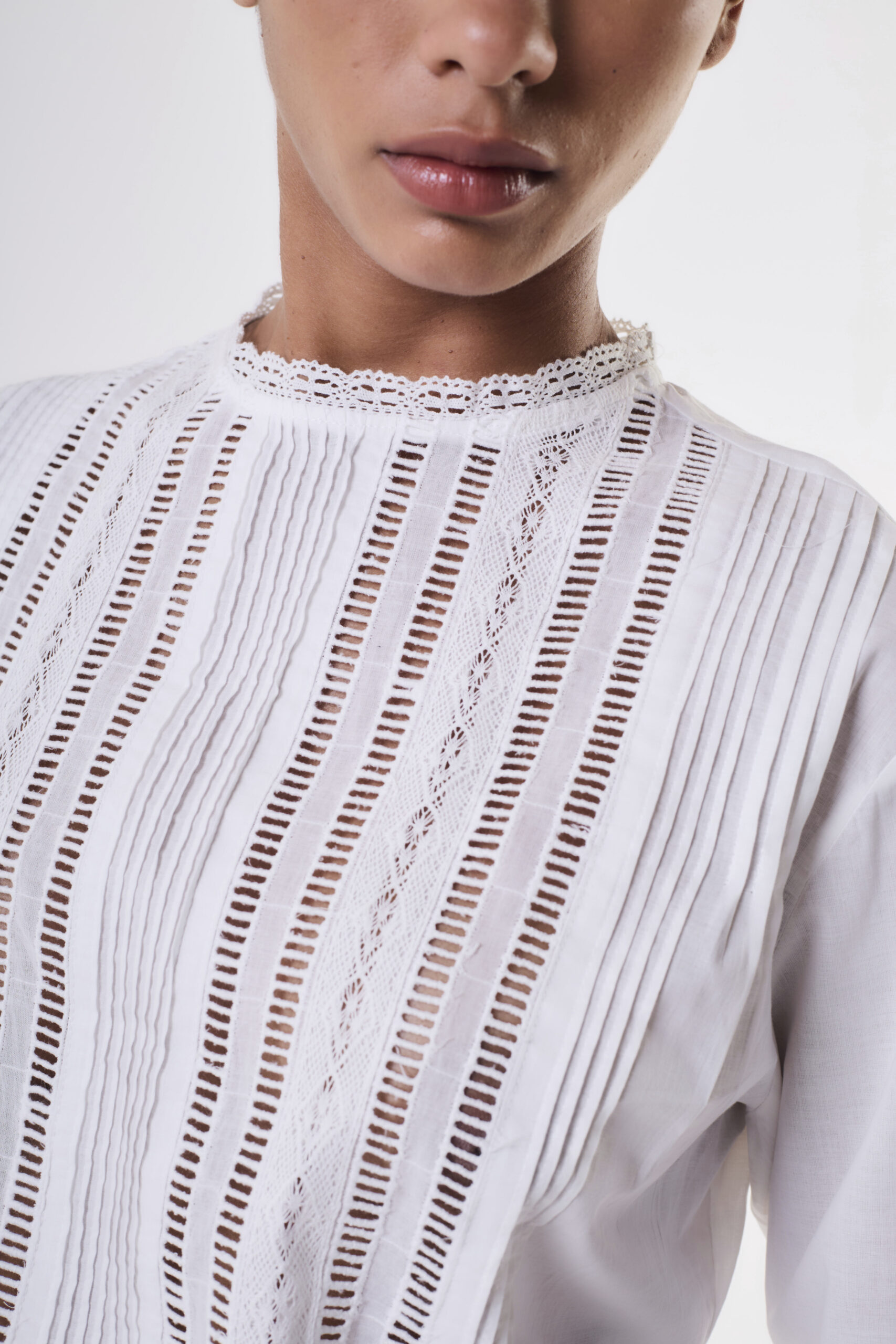 Blusa de mujer importada de calce holgado, con largo modular hasta la segunda cadera. La prenda lleva mangas largas, con detalle de puntilla de algodón al tono en terminación. Además, lleva un cuello subido con puntilla de algodón al tono en terminación. La blusa se caracteriza por llevar alforzas varias a lo largo del delantero, tanto como en el centro como en los laterales. También, lleva puntillas y entredós de algodón al tono que se alternan junto con las alforzas. La prenda asimismo lleva en la altura de la cintura dos lazos del mismo género en los laterales para atar. Se concede acceso a la prenda mediante cartera de botones camiseros en centro de espalda. La blusa está confeccionada en voile de algodón.