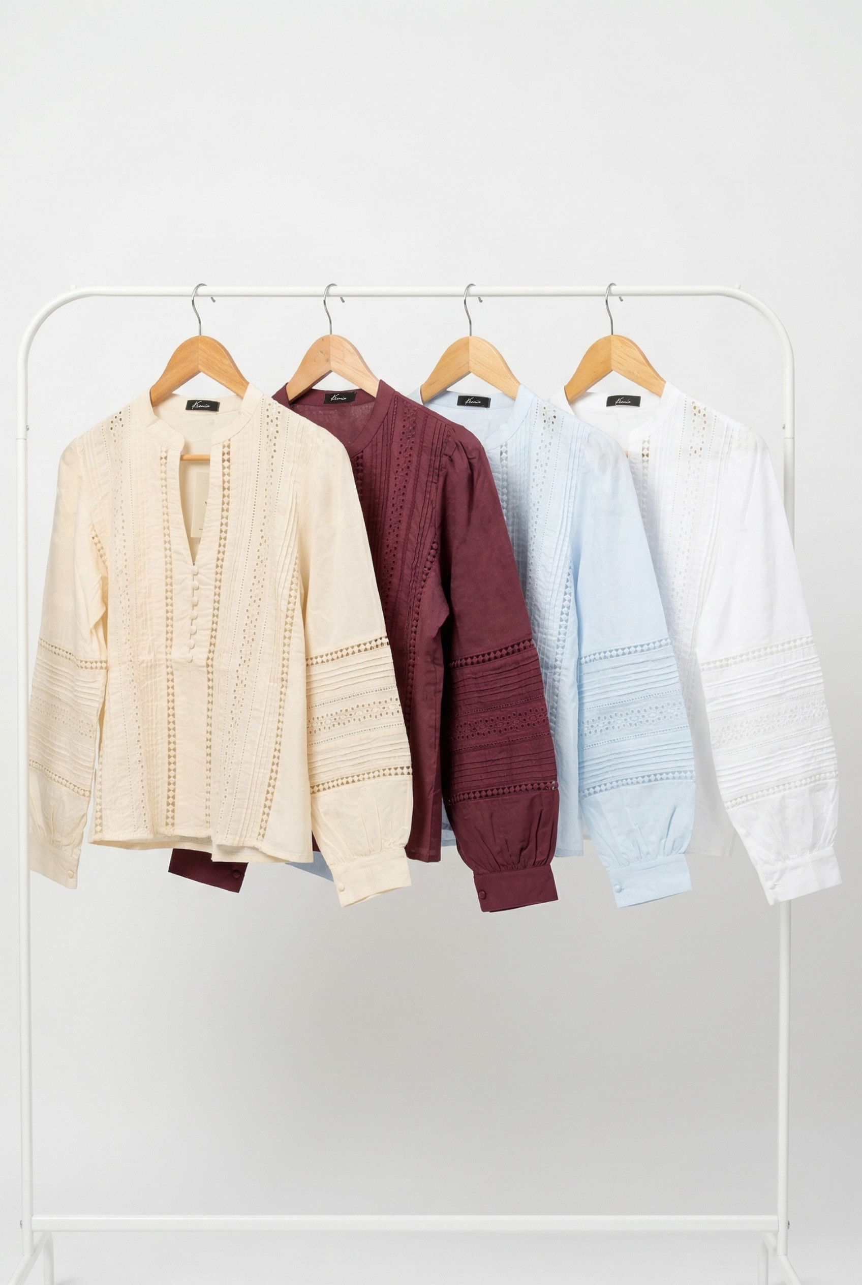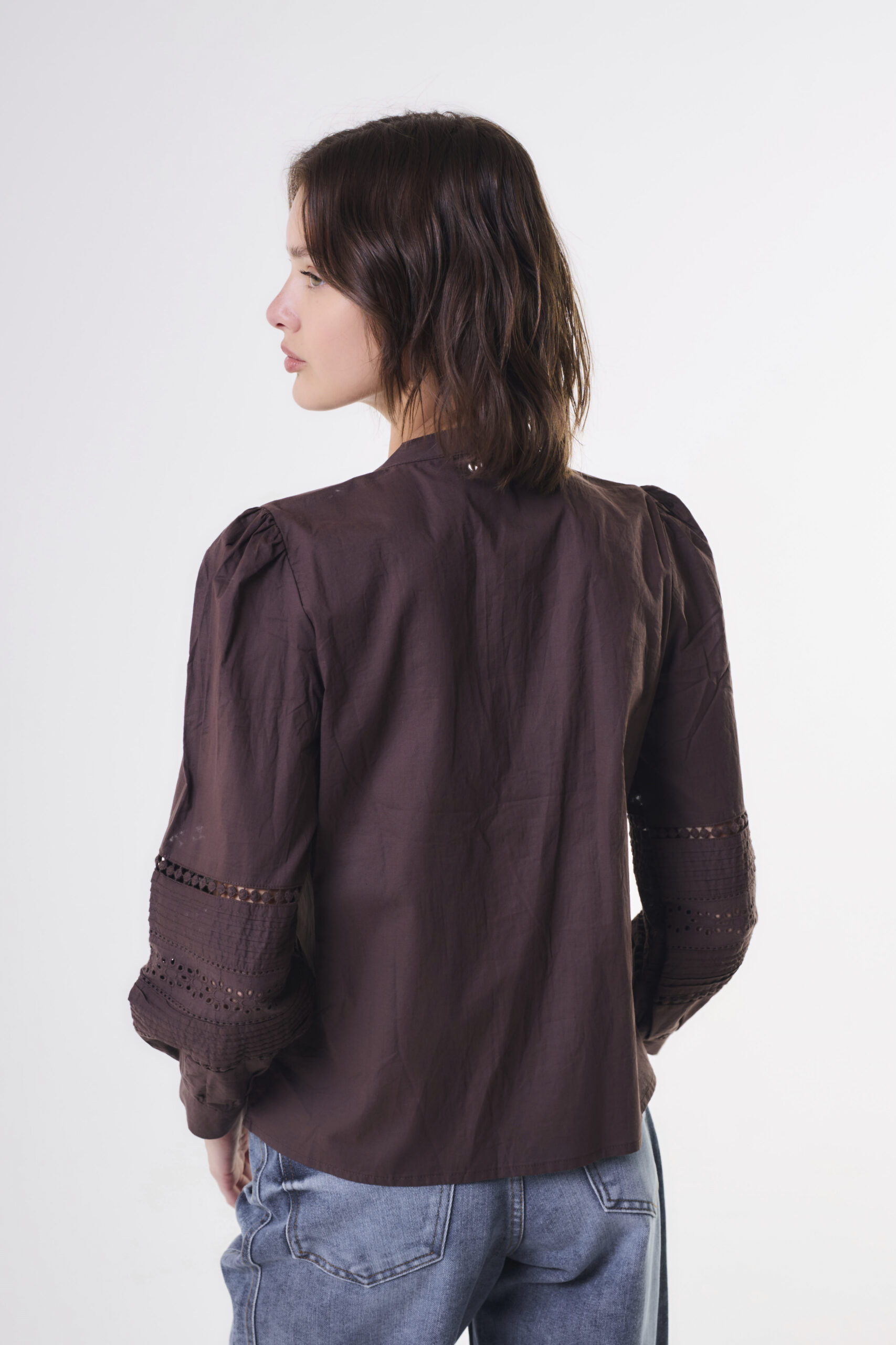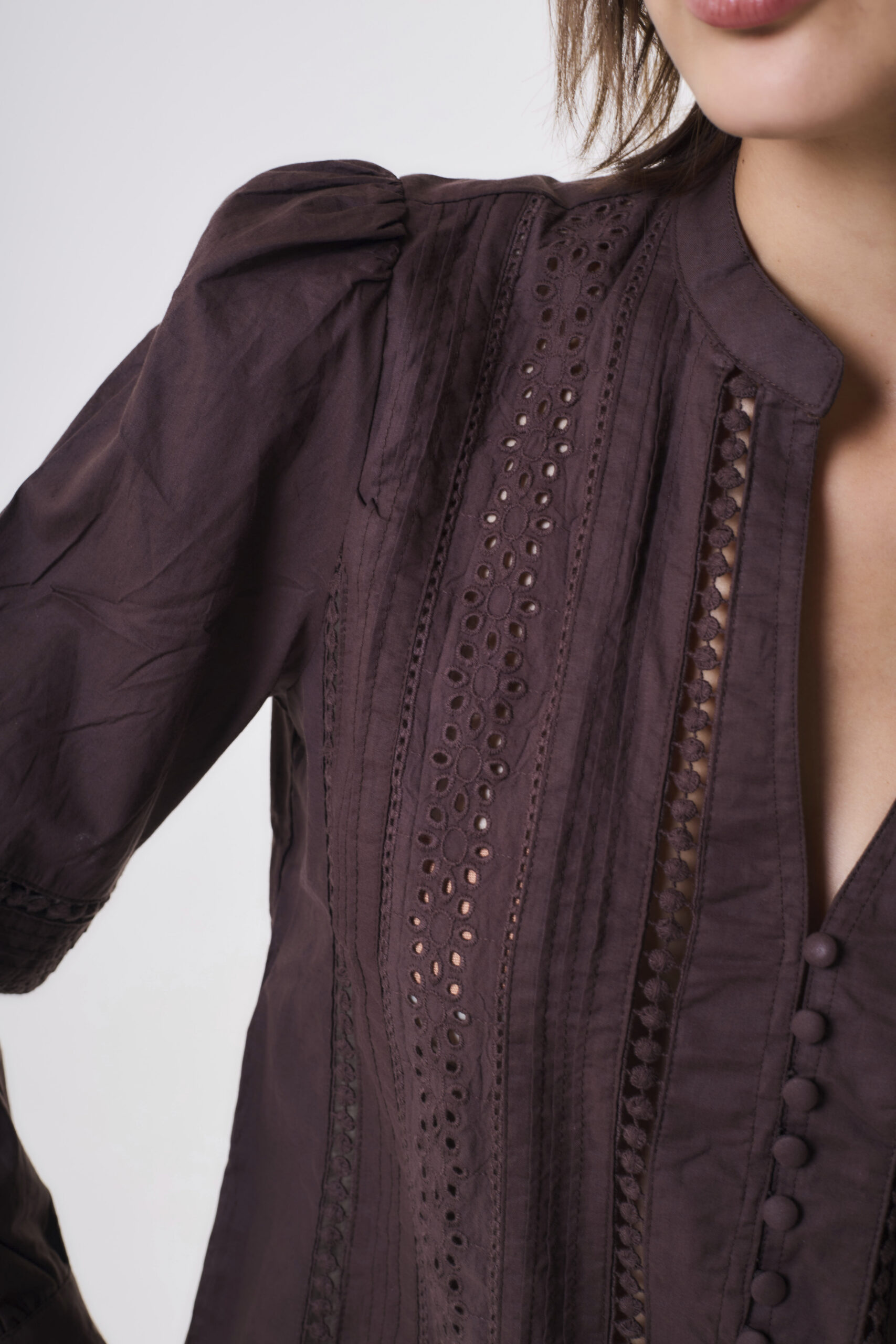 Blusa de mujer importada de calce holgado manga larga. Lleva mangas abullonadas con tirilla con botón. Lleva cuello mao con cartera de botones pechera, con botones de pie forrados del textil base. La camisa tiene entredos, alforzas, y bordados calados que recorren el delantero y las mangas. Detalle de chapa níquel personalizada de la marca en espalda. Largo modular hasta primera cadera. Confeccionado en voile de algodón.