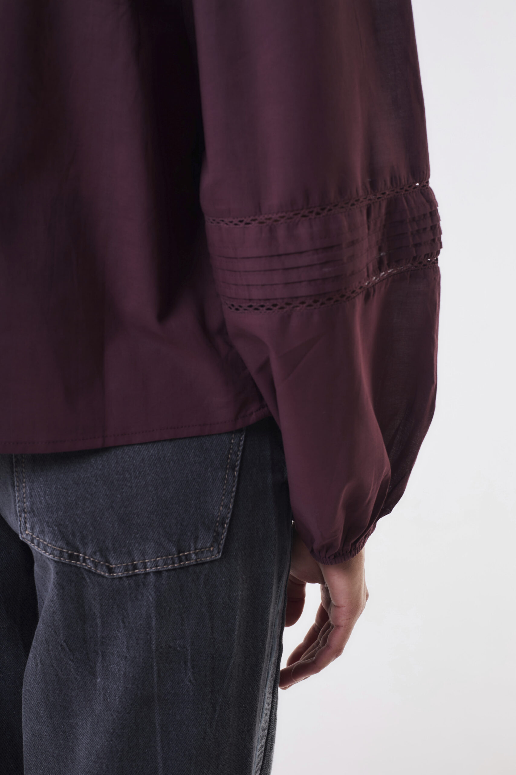 La modelo está usando talle S color Bordó