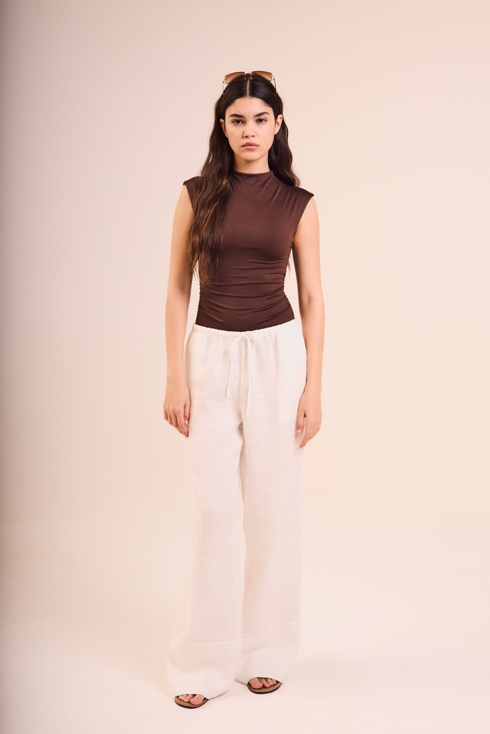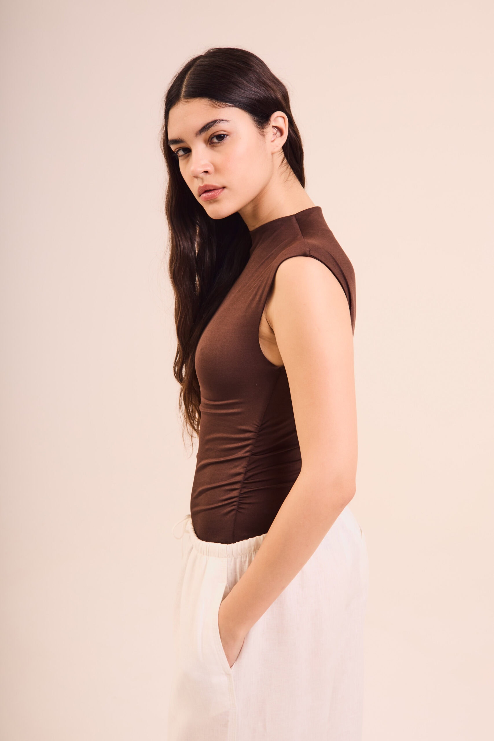 La modelo está usando talle S color Chocolate