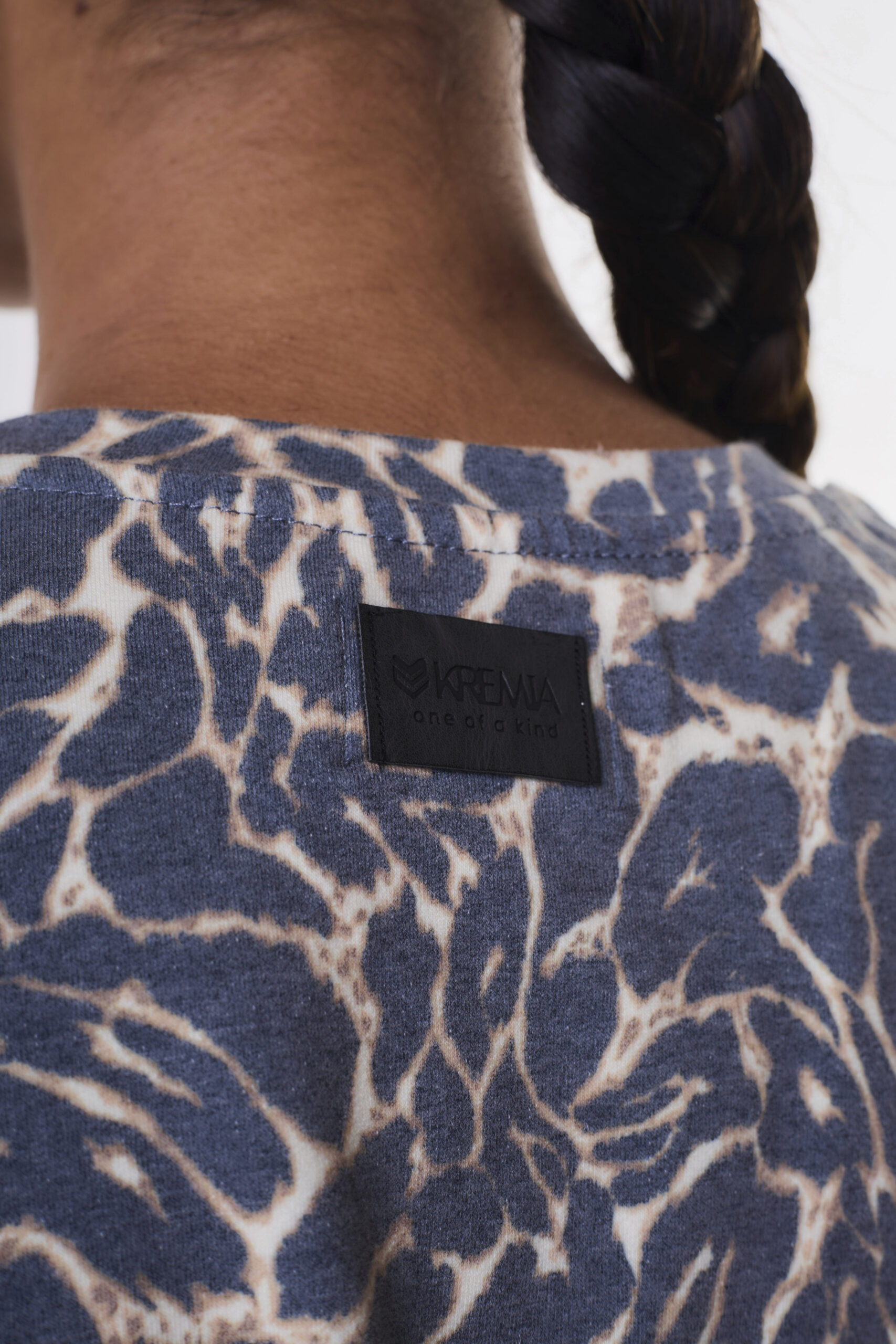 Buzo de mujer calce oversize, cuello redondo con estampa de animal print. Largo modular hasta la cadera.