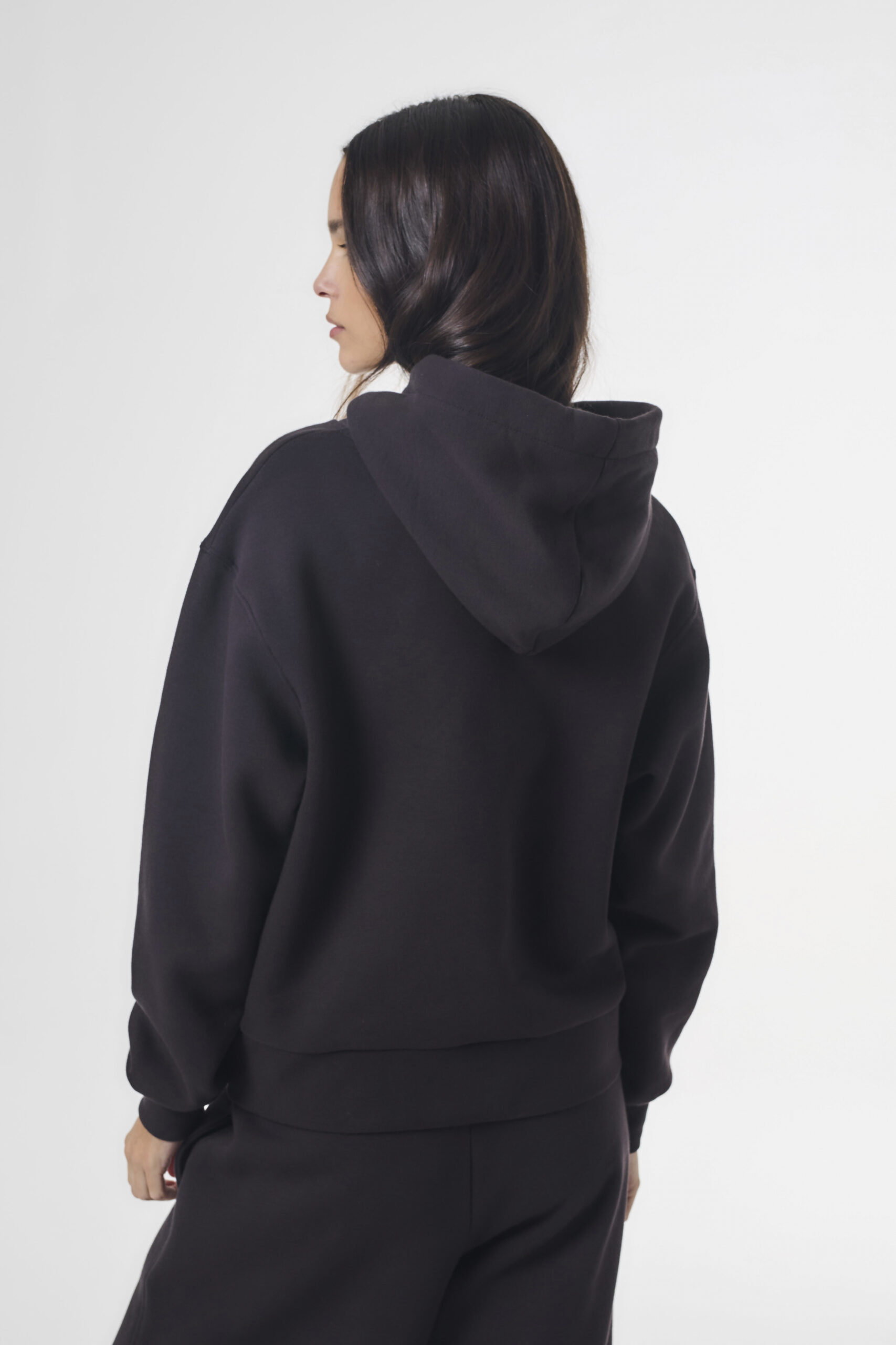 Buzo de mujer calce oversize con largo modular hasta segunda cadera. La prenda lleva capucha con cordón para ajustar la misma. Además, el buzo lleva un bolsillo canguro que se superpone encima de la cintura. La prenda está confeccionada en friza y lleva complemento rib en cintura y puños.