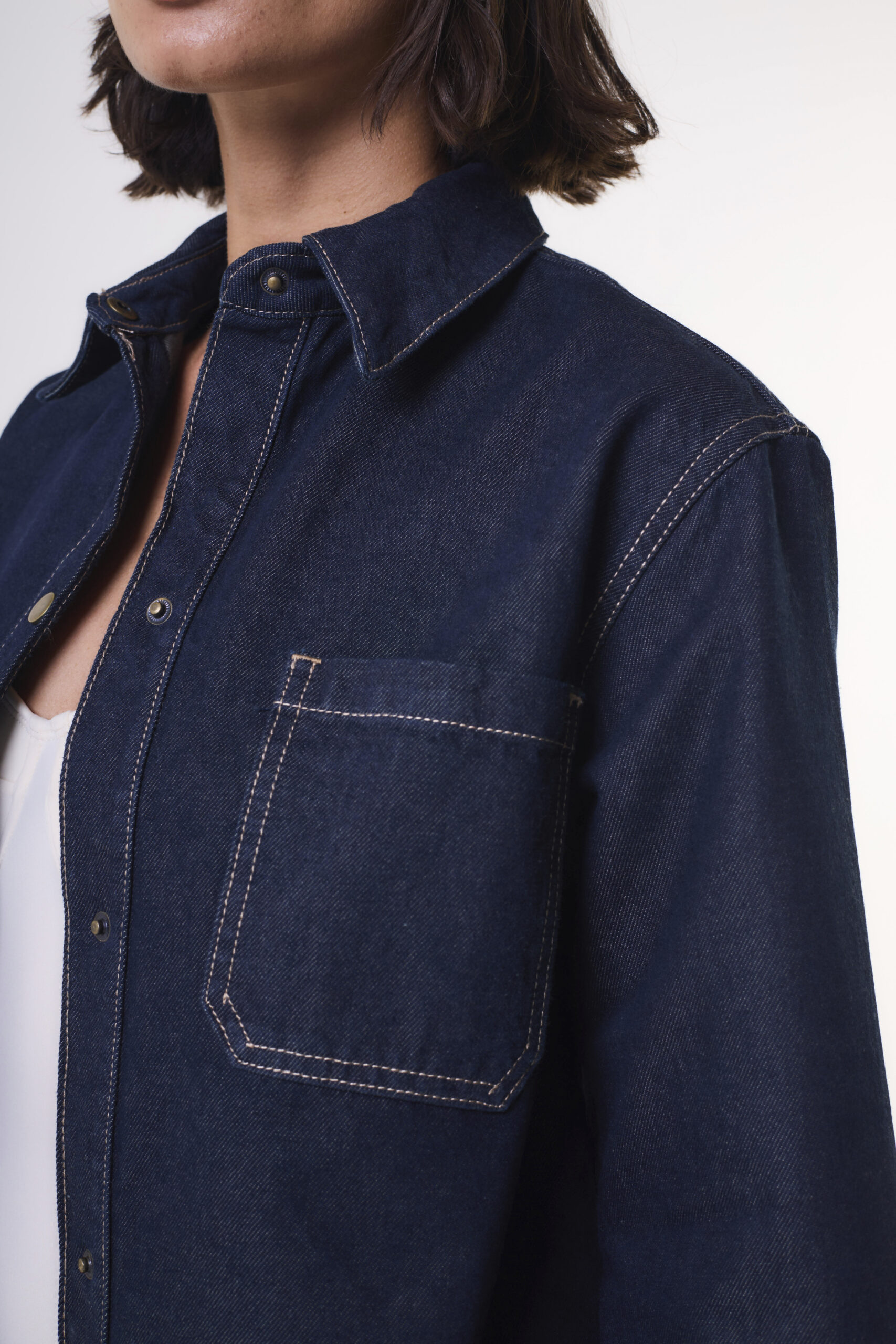 Camisa de mujer clásica con canesú en espalda y bolsillo plaqué. Apertura de botones de niquel personalizados.