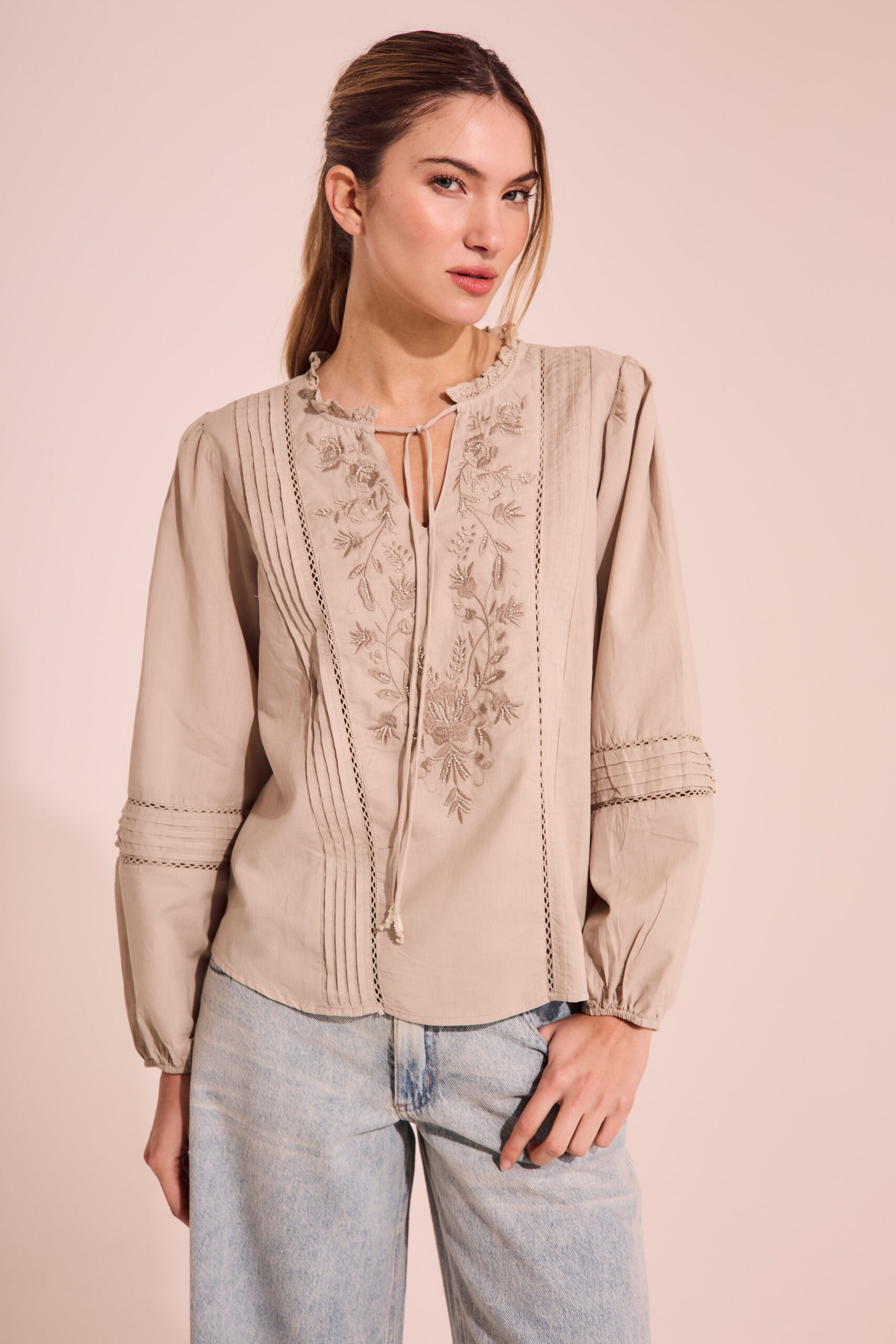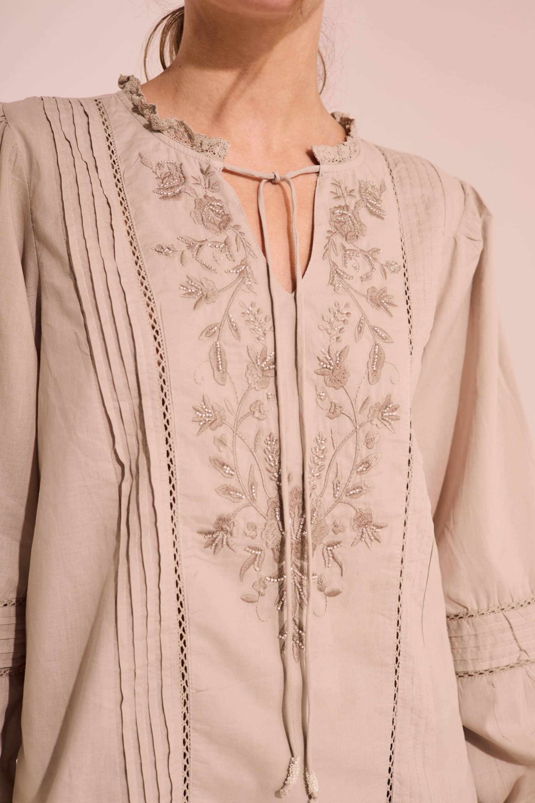 Blusa de calce recto. Lleva mangas largas abullonadas con entredos, alforzas y puños elásticos. Tiene cuello redondo con puntilla y cordón en textil base con terminal de mostacillas.El delantero tiene un bordado de flores con mostacillas al tono, y recorrido de entredos con alforzas. Largo modular hasta segunda cadera. Confeccionado en voile de algodón.