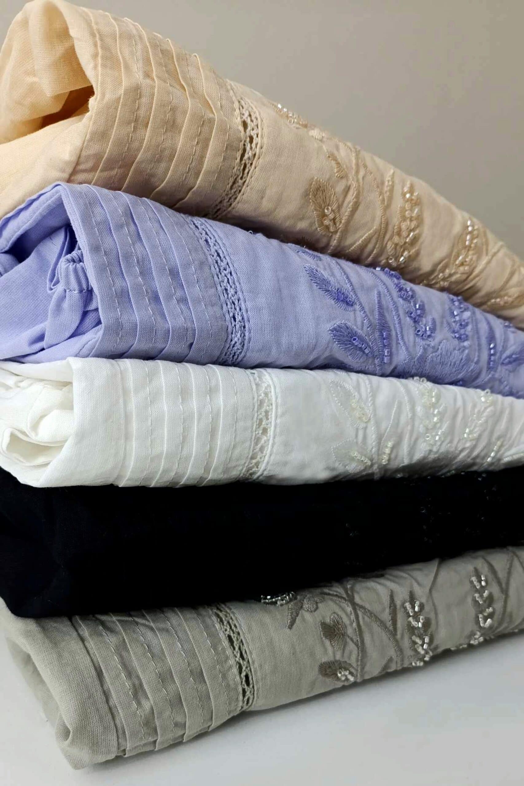 Blusa de calce recto. Lleva mangas largas abullonadas con entredos, alforzas y puños elásticos. Tiene cuello redondo con puntilla y cordón en textil base con terminal de mostacillas.El delantero tiene un bordado de flores con mostacillas al tono, y recorrido de entredos con alforzas. Largo modular hasta segunda cadera. Confeccionado […]