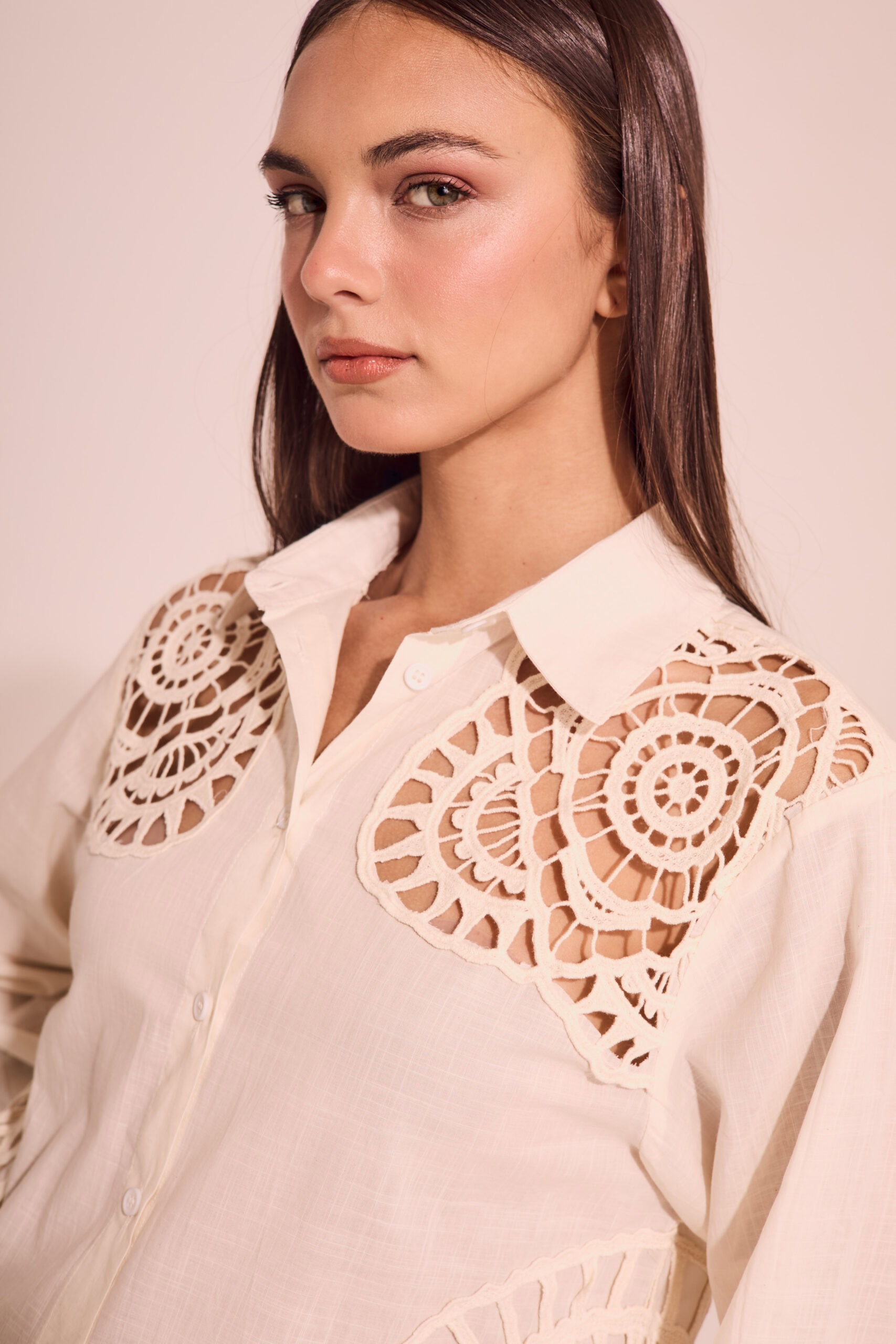 Camisa de calce recto manga larga. Lleva mangas clásicas con frunce en puño y tirilla con botón. Tiene pie de cuello, cuello y cartera de botones simple con botones camiseros al tono. La camisa tiene calado de algodón al tono con sustracción a la altura de los hombros y calado en los laterales. Detalle de chapita niquel personalizada de la marca en espalda. Largo modular hasta segunda cadera. Confeccionado en voile de algodón slub.