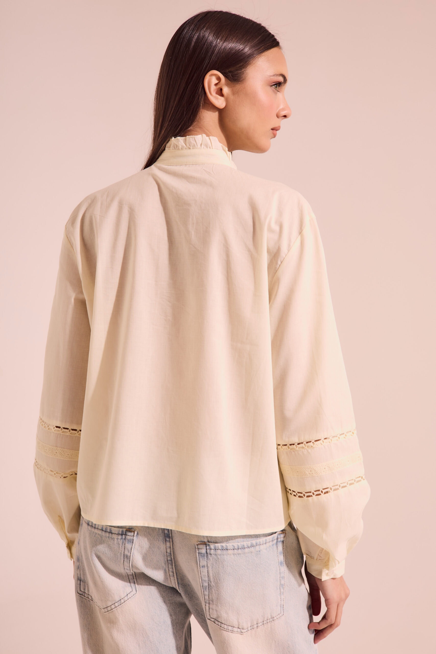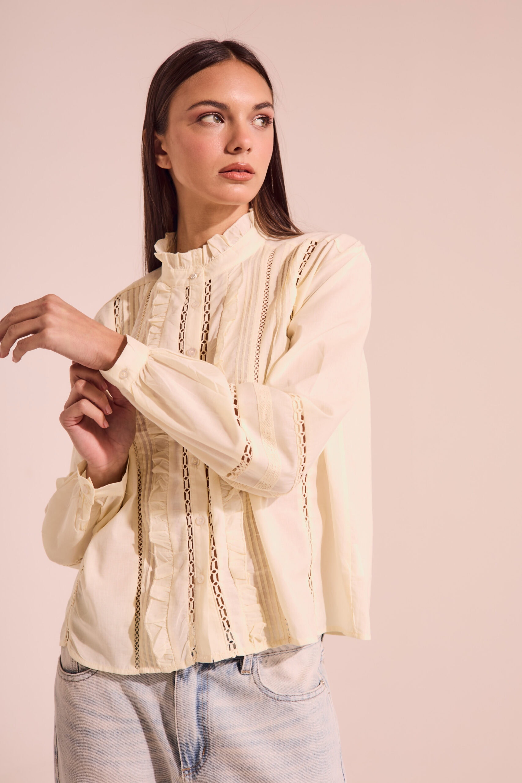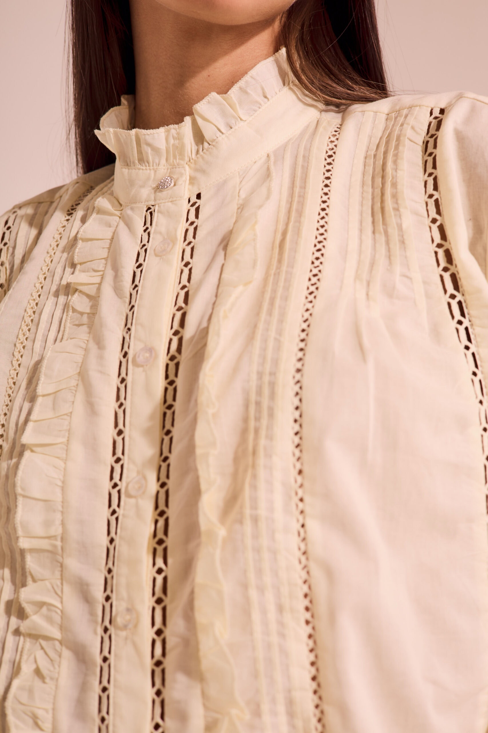 Camisa importada de mujer de calce recto. Lleva mangas largas abullonadas con entredos, puntilla al tono y puños con apertura y botón. Tiene cuello mao con volados, alforzas y entredos que recorren todo el delantero. Largo modular hasta segunda cadera. Acceso mediante botones camiseros al tono personalizados de la marca. Confeccionado en voile de algodón.