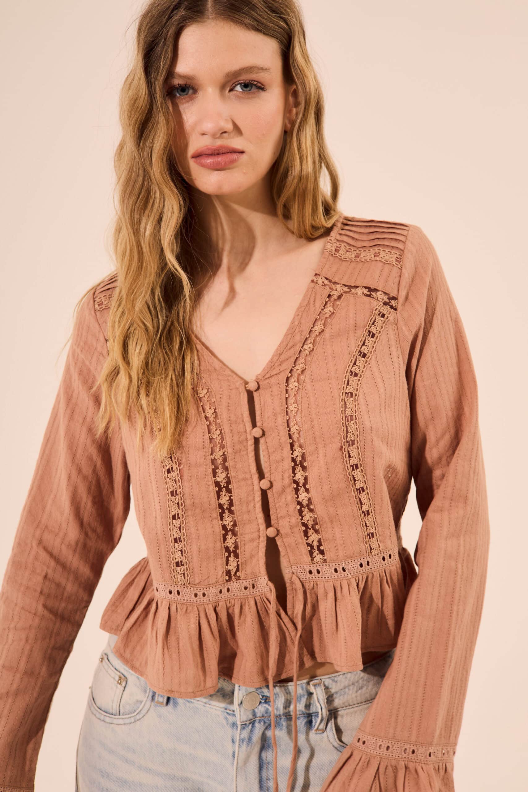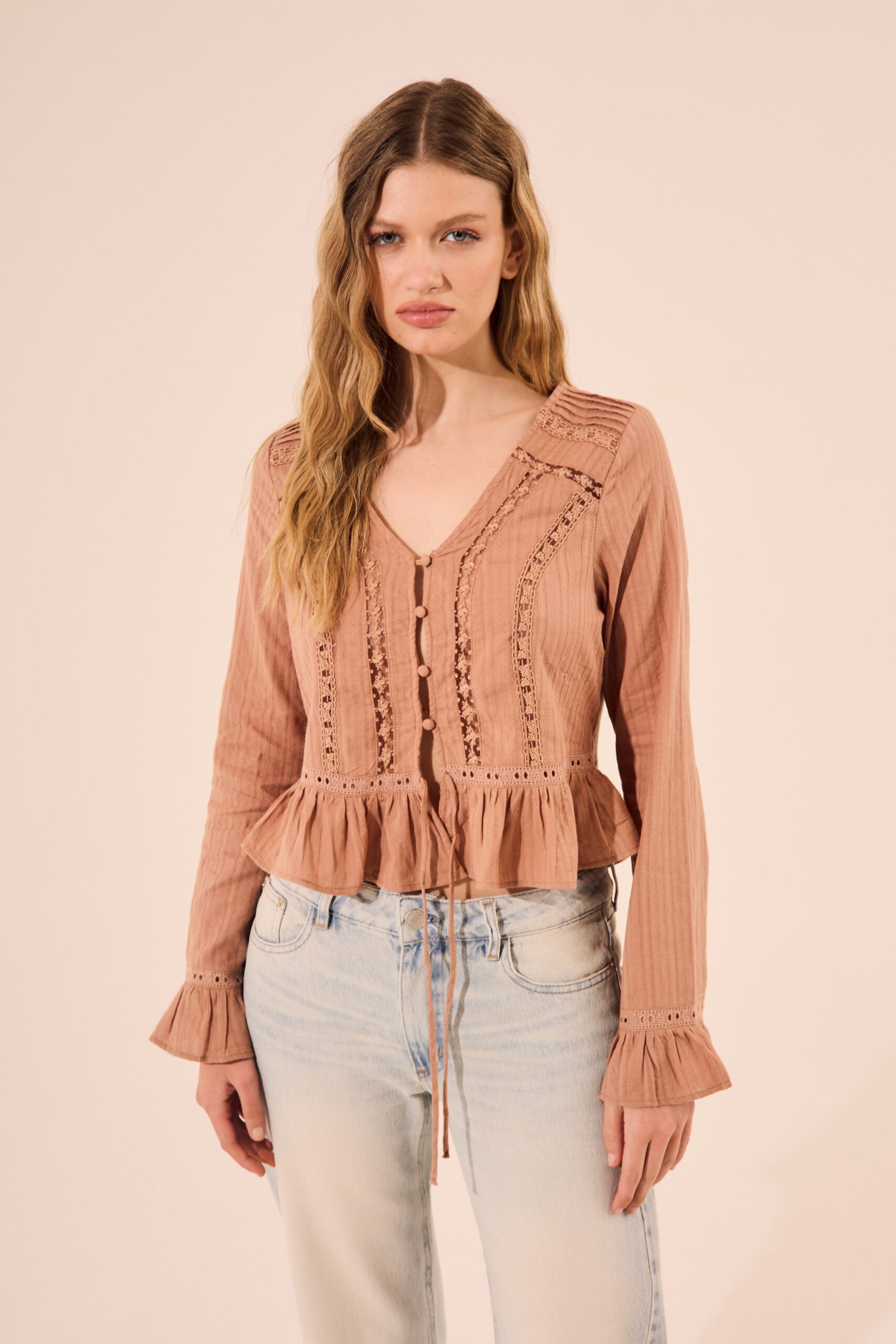 Camisa de calce recto. Tiene mangas largas con puños con entredos y volados en puños. Escote en V, alforzas en hombros, puntillas y entredos en recorridos horizontales y verticales. Entredos en cintura, generando un recorte con volados en ruedo. Lleva lazo en textil base en cintura. Largo modular hasta primera cadera. Acceso mediante botones de pie forrados con textil base. Confeccionado en rattier de algodón.