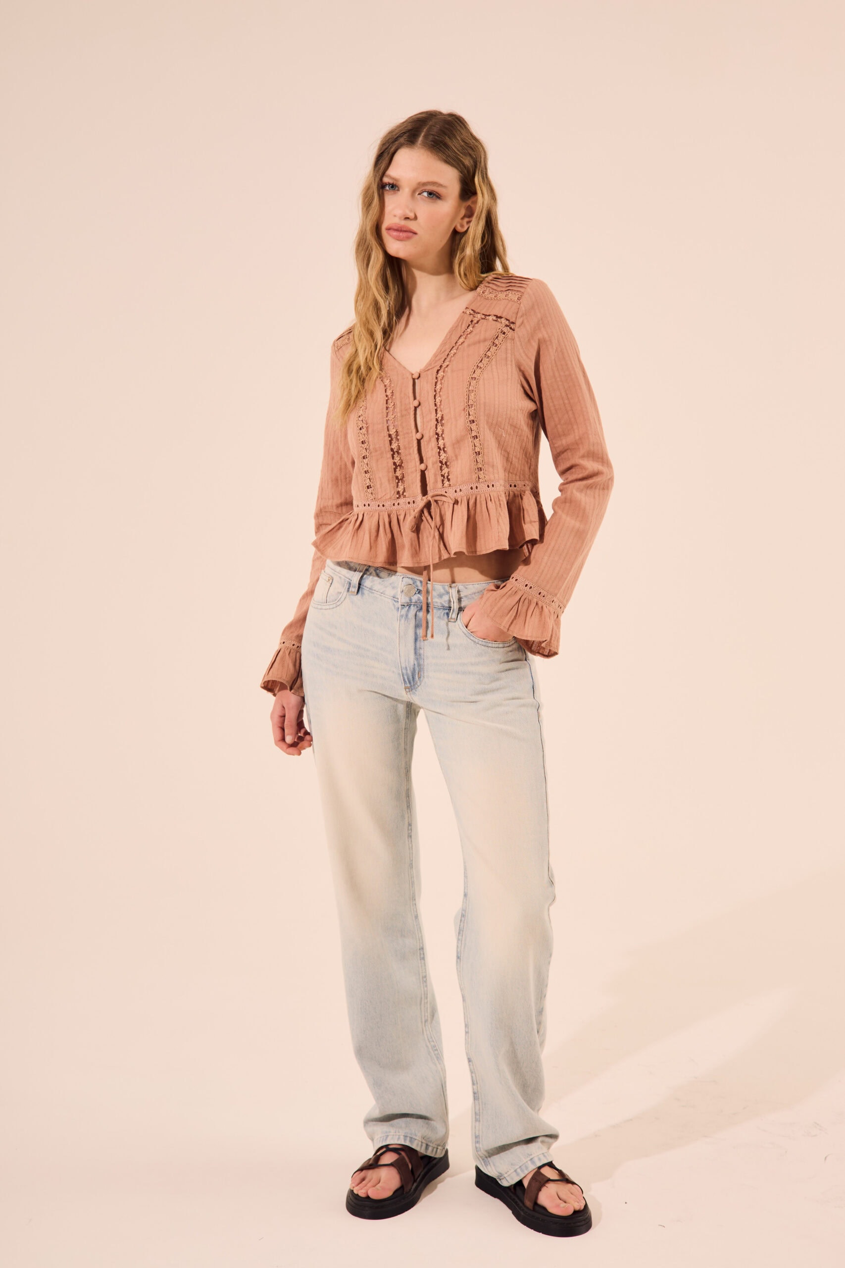 Camisa de calce recto. Tiene mangas largas con puños con entredos y volados en puños. Escote en V, alforzas en hombros, puntillas y entredos en recorridos horizontales y verticales. Entredos en cintura, generando un recorte con volados en ruedo. Lleva lazo en textil base en cintura. Largo modular hasta primera […]