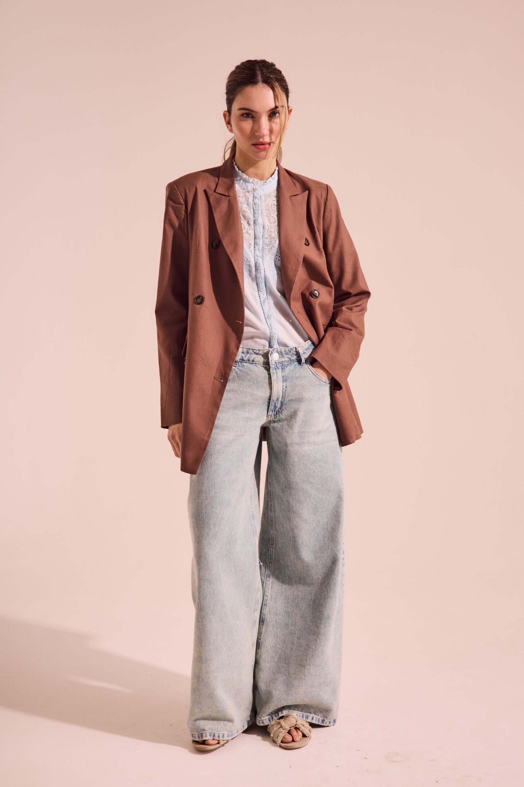 Camisa de calce recto. Lleva mangas largas abullonadas con puños con puntilla al tono, apertura y botón. Tiene cuello mao con puntilla, broderie y bordado al tono en delantero. Se encuentra un entredos y puntilla con volados en el recorrido de la cartera de botones Largo modular hasta primera cadera. […]