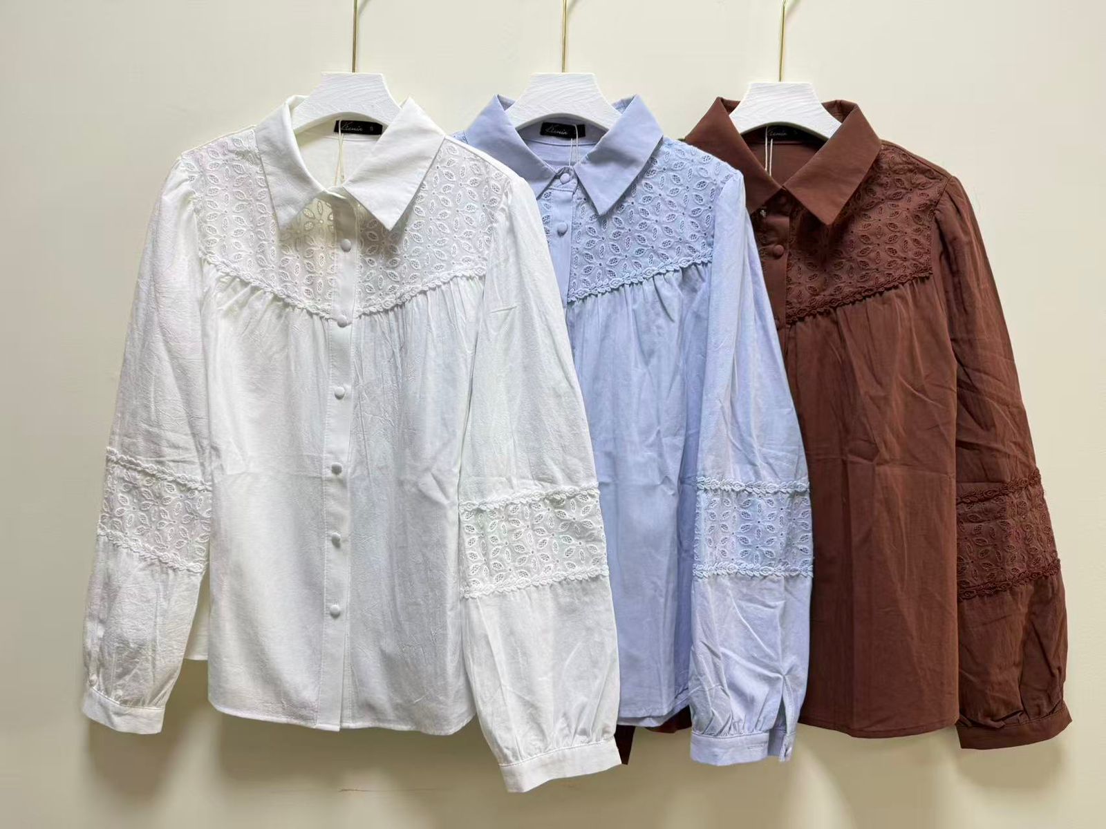 Camisa de mujer importada de calce semi-evase con silueta holgada largo modular hasta primera cadera. Cuenta con pie de cuello de estilo clásico. La prenda presenta detalles de calado con diseño floral geométrico en el canesú con terminación de tira bordada y pliegues. Lleva manga larga semi-abullonadas con detalles calados y tira bordada entredos detalle en terminación de pliegues con puño. La prenda se accede mediante unos botones frontales forrados en la misma tela. La prenda está confeccionada en tejido ratier.