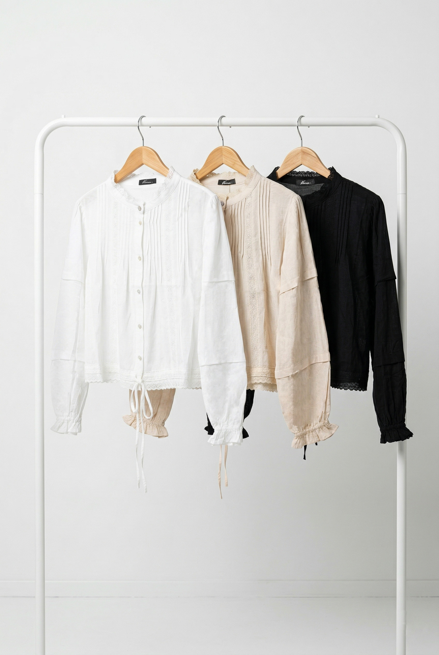 Camisa de mujer importada de calce evasé con largo modular hasta la primera cadera. Lleva mangas largas abullonadas con detalles de pliegues anchos y lleva puños elásticos. Además, los delanteros poseen alforzas en el escote, puntilla al tono en el recorrido del delantero al igual que en el recorrido del ruedo. El cuello es redondo con puntilla al tono en la terminación. El ruedo se distingue por tener un lazo del género base ajustable. Se concede acceso a la prenda mediante botones nacarados, y el primer botón de pie con strass. La prenda está confeccionada en voile de algodón.