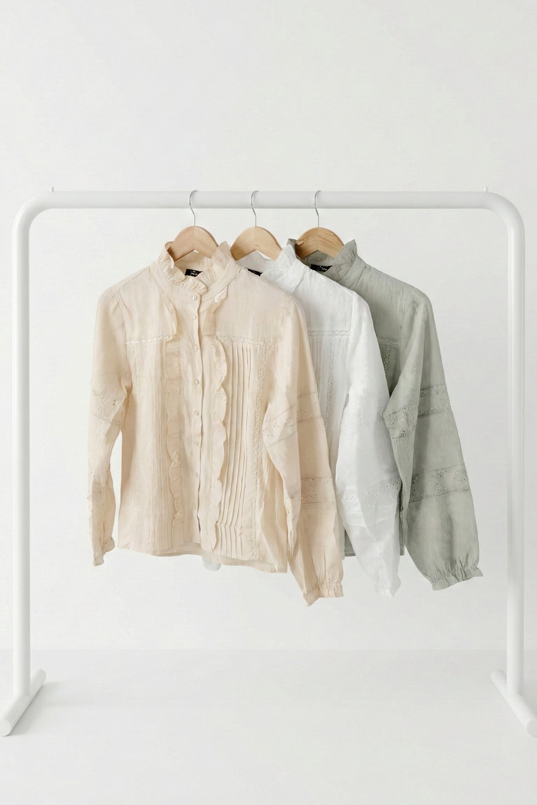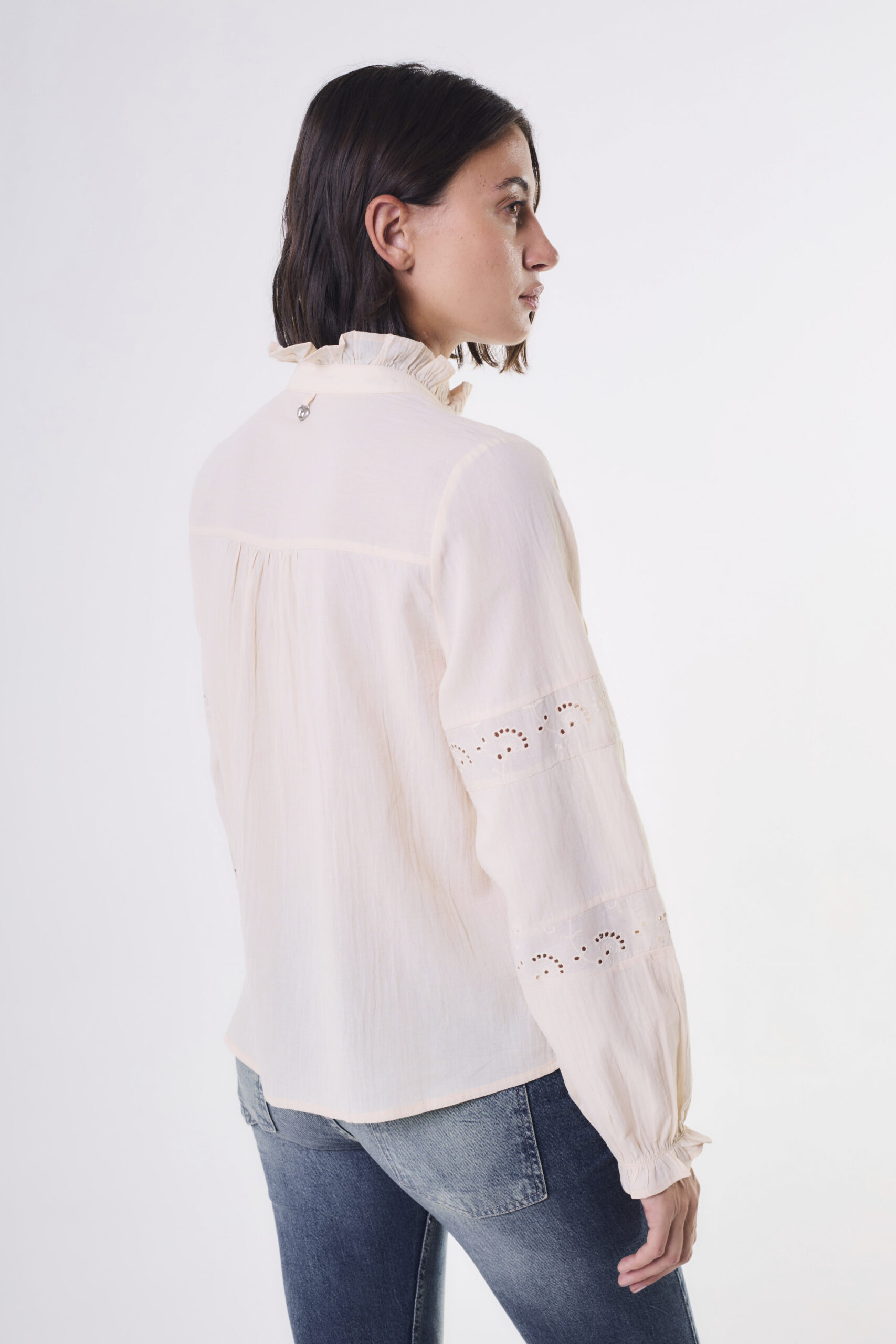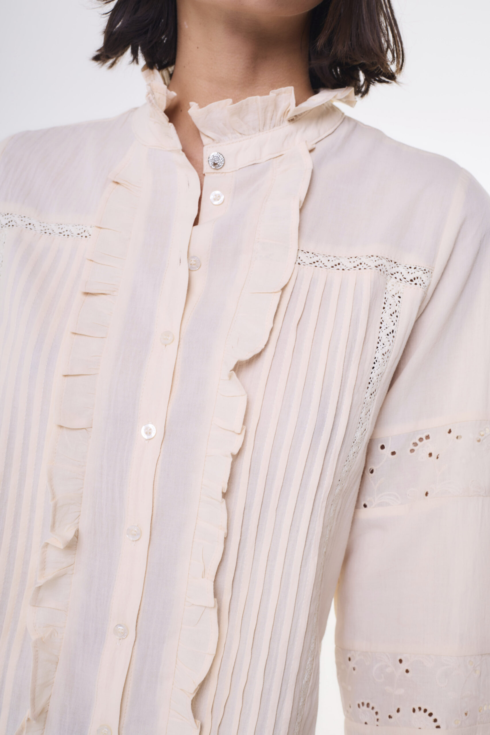 Camisa de mujer importada de calce recto con largo modular hasta la primera cadera. Lleva mangas largas abullonadas con puños elásticos y recortes con bordados calados al tono a lo largo de la manga. Los delanteros llevan alforzas verticales, entredos al tono y volados. El cuello es redondo con terminación de volados. La espalda lleva canesú con frunces debajo del mismo. También, lleva una chapita personalizada en el centro del cuello de espalda. Se concede acceso a la prenda mediante botones camiseros, y el primer botón siendo de pie con strass. La camisa está confeccionada en cey de algodón.